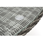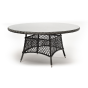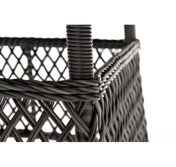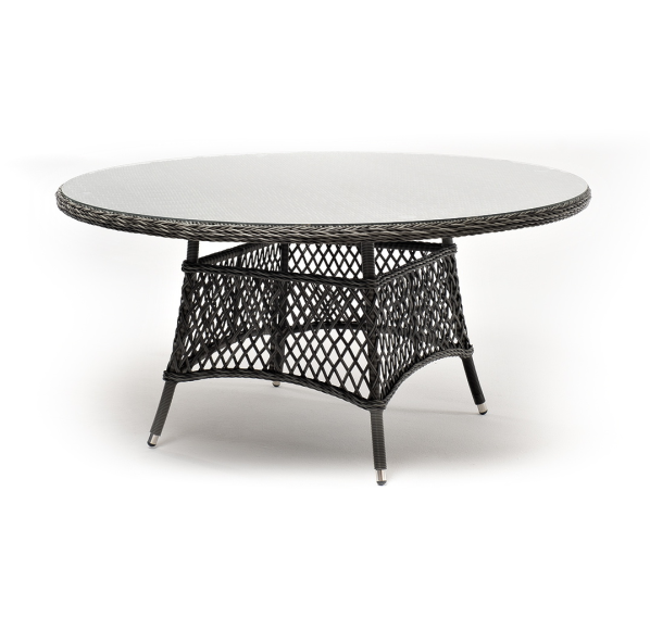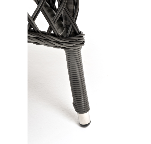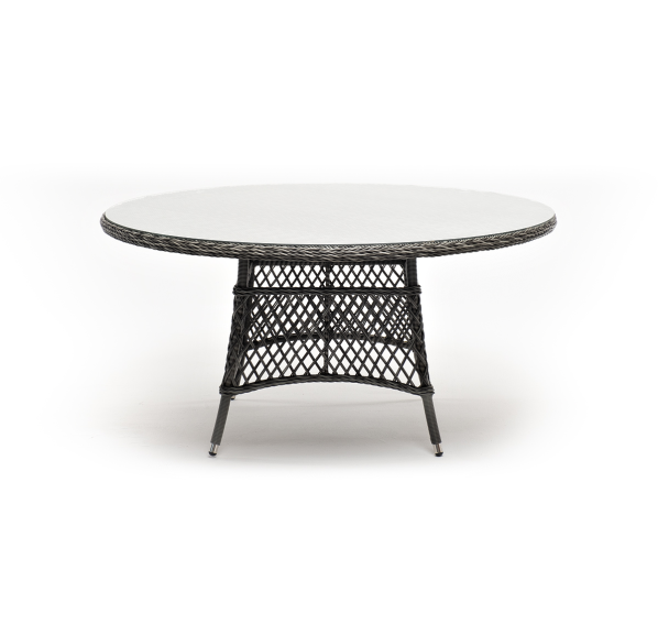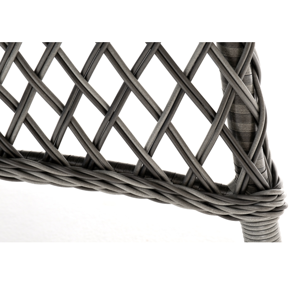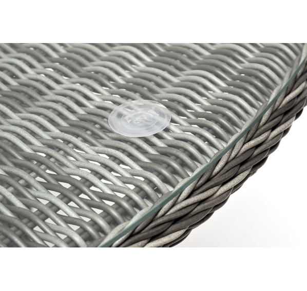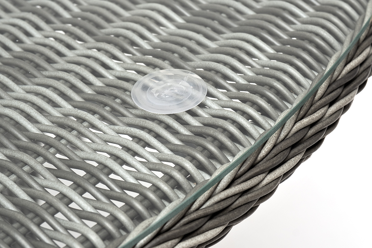 В качестве основания выступает каркас, выполненный из алюминия и оплетён круглым искусственным ротангом графитового цвета. Рабочую плоскость покрывает 5 мм столешница из ударопрочного закаленного стекла.