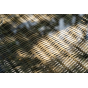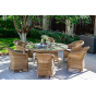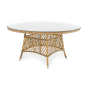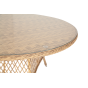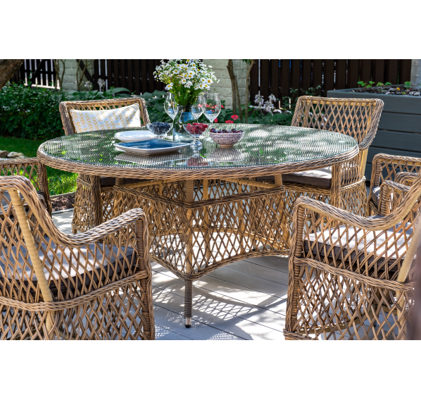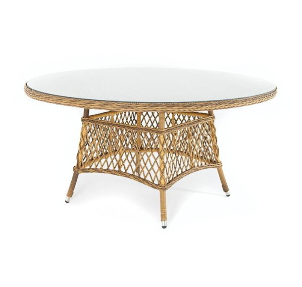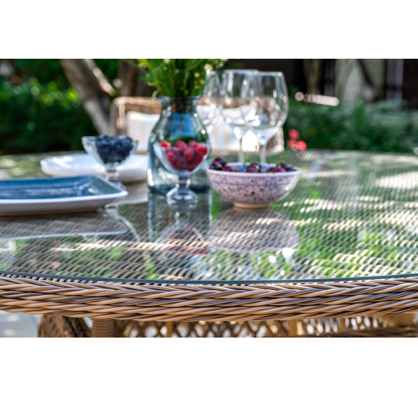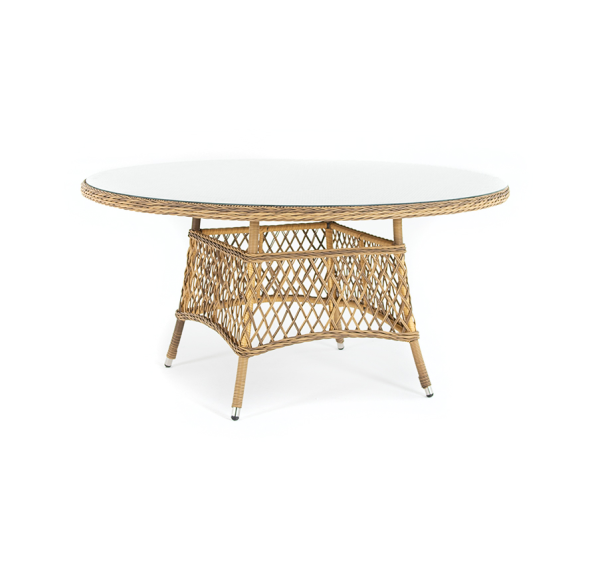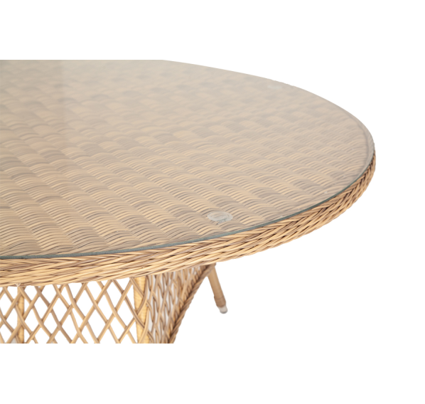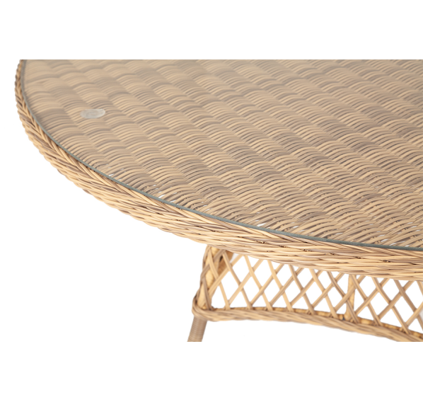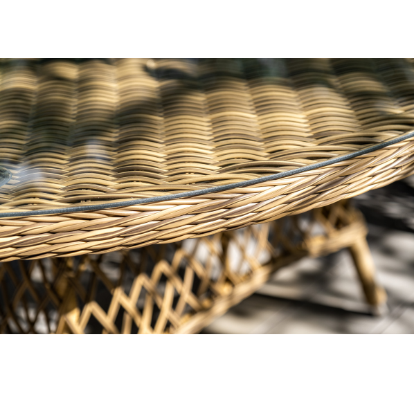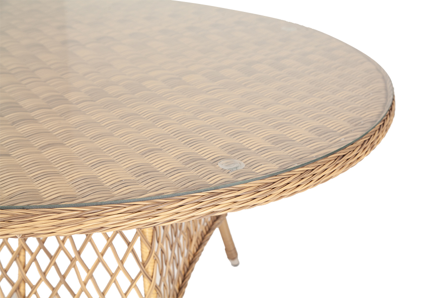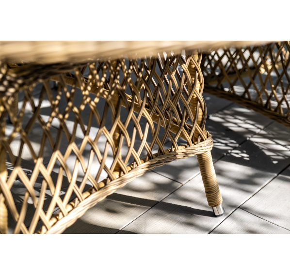 В качестве основания выступает каркас, выполненный из алюминия и оплетён круглым искусственным ротангом соломенного цвета. Рабочую плоскость покрывает 5 мм столешница из ударопрочного закаленного стекла.