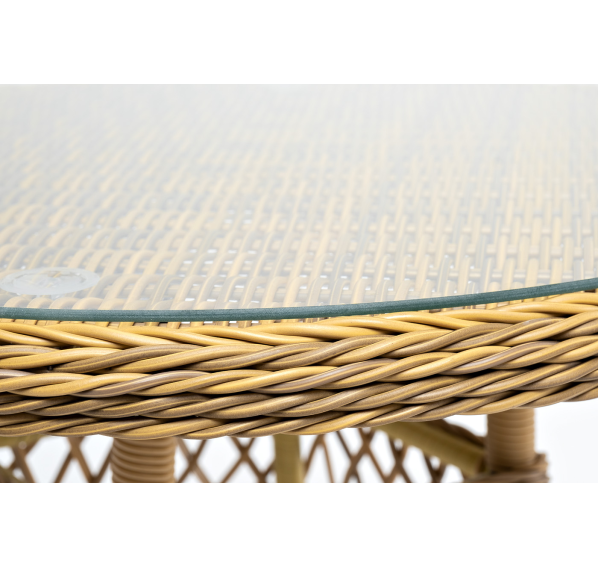 Столешница покрыта прочным стеклом, толщиной 5 мм. Благодаря высокопрочным материалам, обеденный стол очень практичный и подходит для всесезонного использования даже на улице.