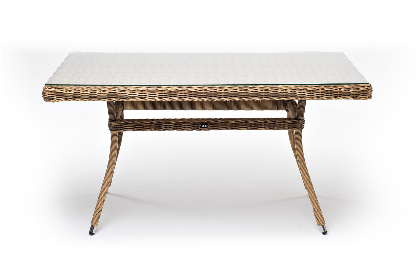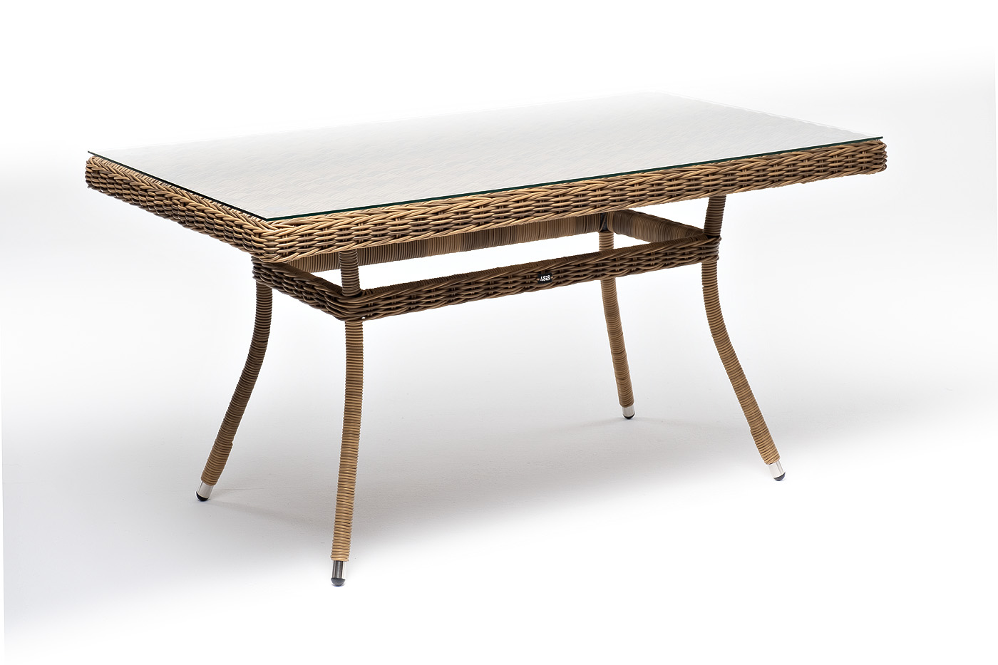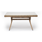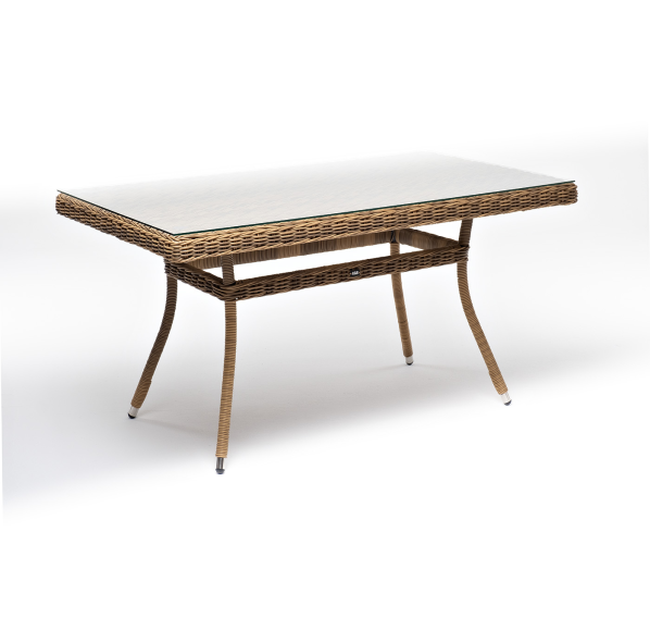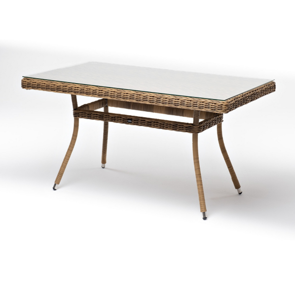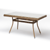 Каркас произведен из прочного алюминия, оплетка которого, выполнена вручную ротангом соломенным цвета. Поверхность защищает стеклянная столешница, толщиной 5 мм.