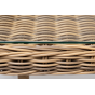 Каркас произведен из прочного алюминия, оплетка которого, выполнена вручную ротангом соломенного цвета. Поверхность защищает стеклянная столешница, толщиной 5 мм.