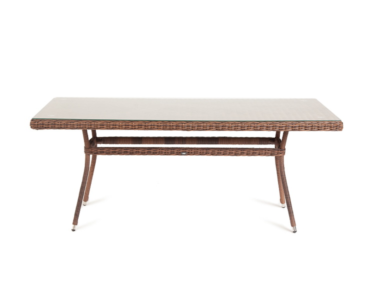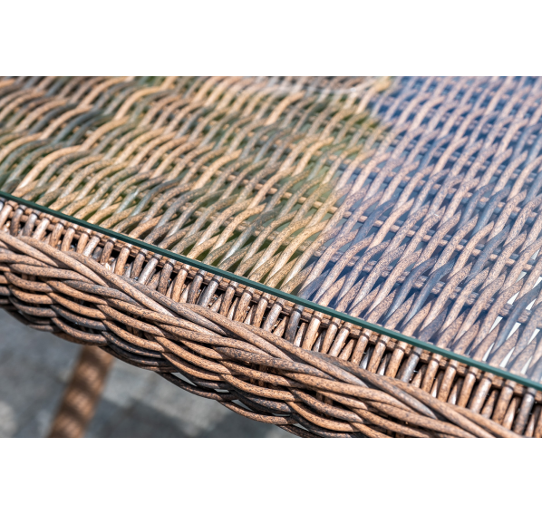 Каркас произведен из прочного алюминия, оплетка которого, выполнена вручную круглым ротангом коричневого цвета. Поверхность защищает стеклянная столешница, толщиной 5 мм.