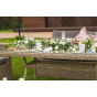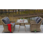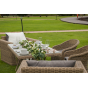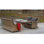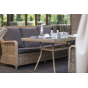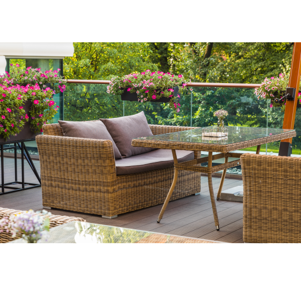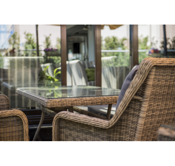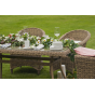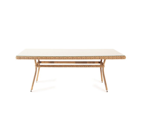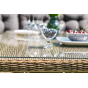 Каркас садового стола изготовлен из алюминия, вручную оплетенного круглым искусственным ротангом натурального соломенного оттенка.