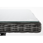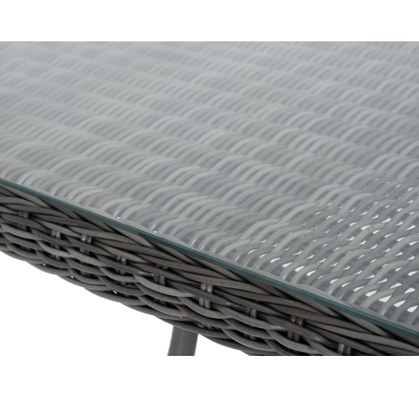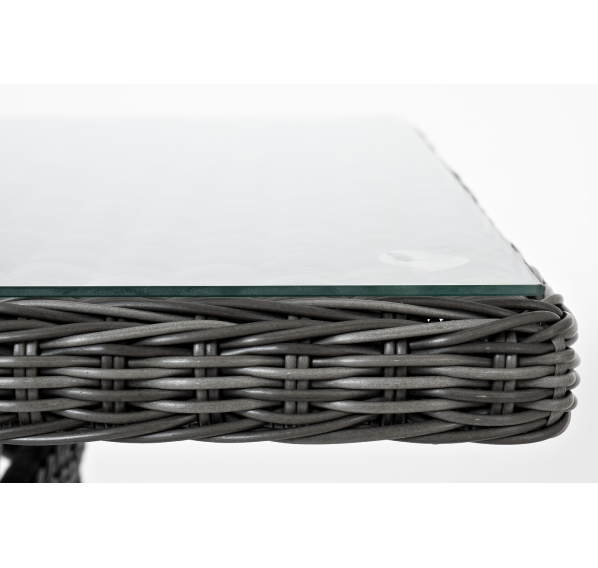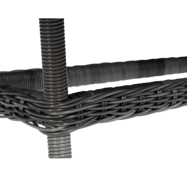 Каркас изделия изготовлен из прочного, но очень легкого алюминия, оплетенного вручную искусственным ротангом круглого плетения цвета "графит". Это долговечный материал, устойчивый к переменам погоды, атмосферным осадкам, прямым солнечным лучам. Благодаря ему стол можно использовать круглогодично под открытым небом.