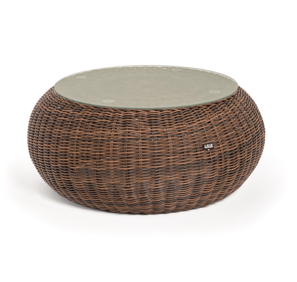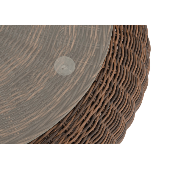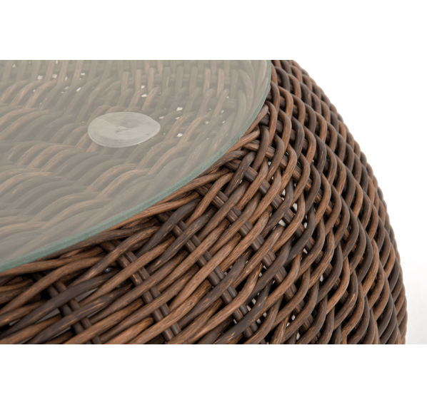 Каркас столика изготовлен из алюминия, вручную оплетенного круглым искусственным ротангом.