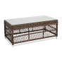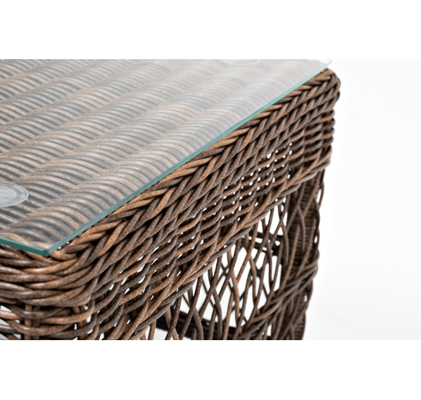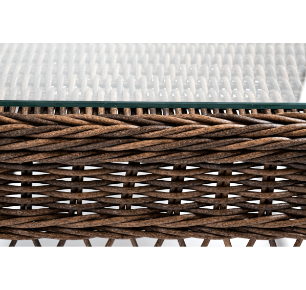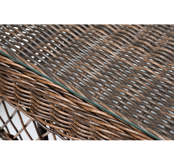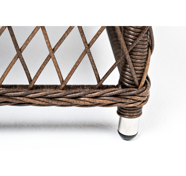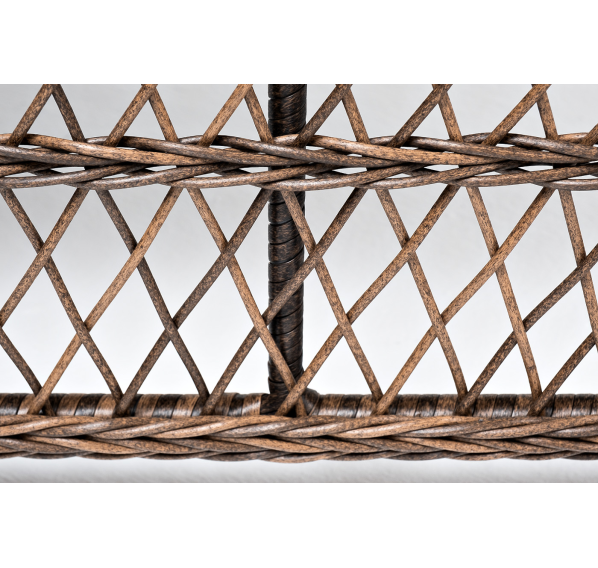 Каркас изготолен из алюминия, который гарантирует устойчивость при размещении на любой поверхности. В качестве декоративного элемента выступает ручная оплетка на основе круглого искусственного ротанга, представленного в коричневом оттенке.