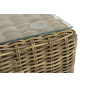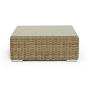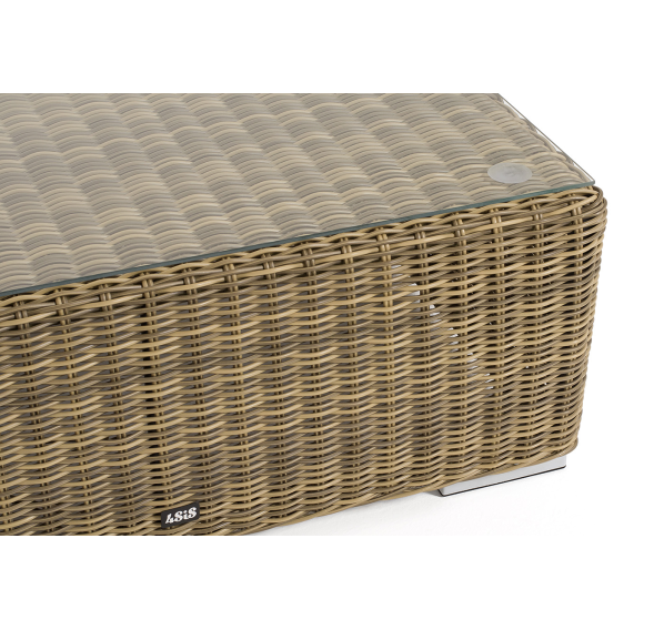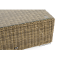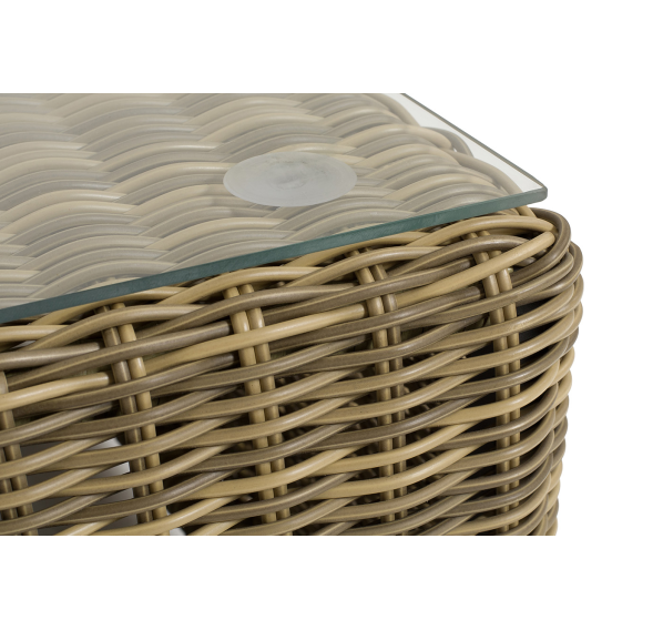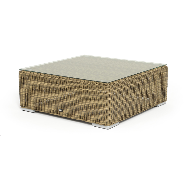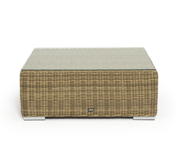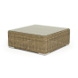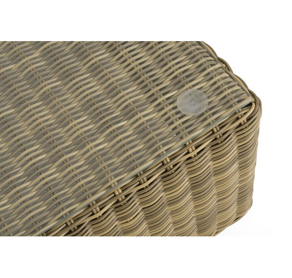 Размер модели – 950×950×350 мм. Ее каркас сделан из высокопрочного алюминия, который оплетен искусственным ротангом с помощью ручного круглого плетения. Столик представлен в соломенном цвете.