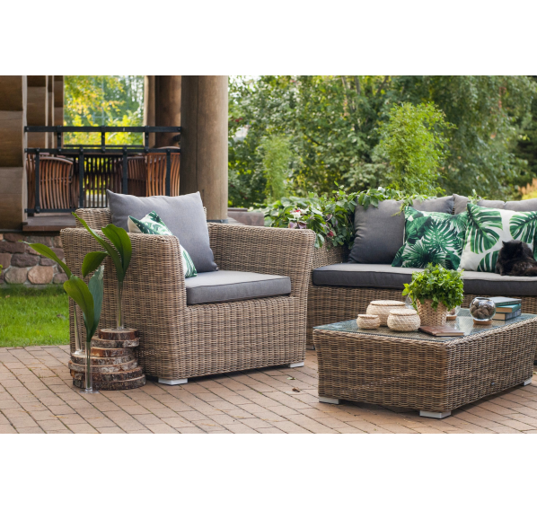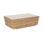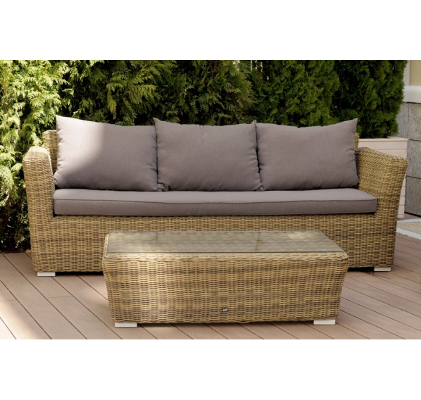 Размер модели – 1100×660×340 мм. Устойчивость и прочность ей придает каркас, выполненный из высококачественного алюминия. Каркас оплетен вручную с помощью круглого искусственного ротанга. Мебель выполнена в соломенном цвете.