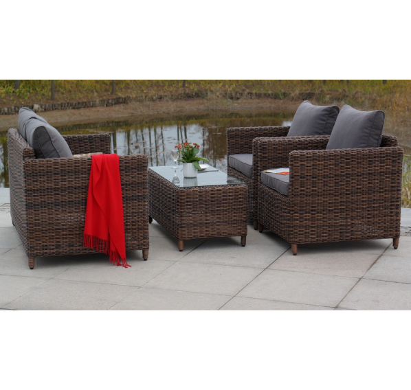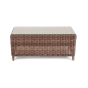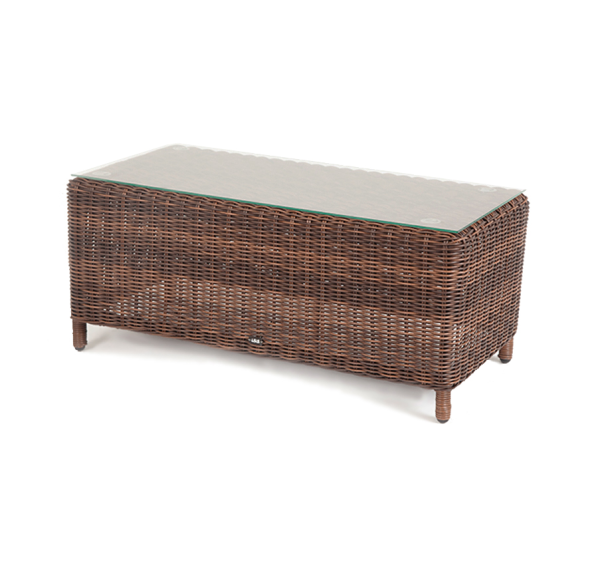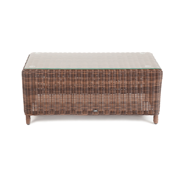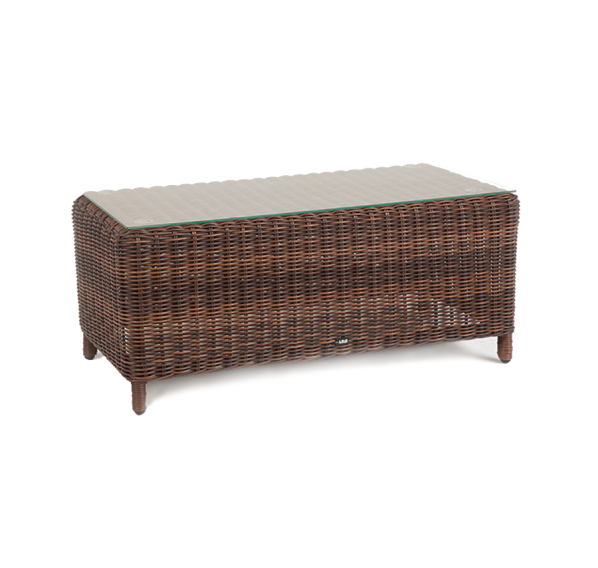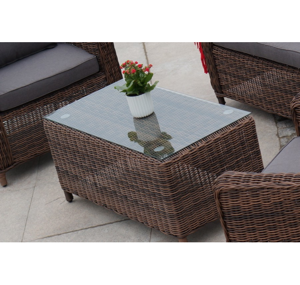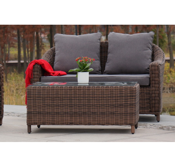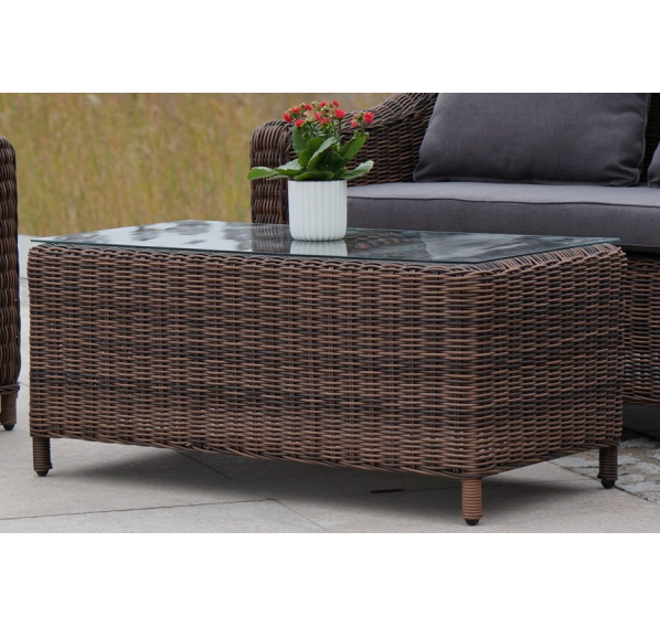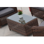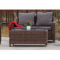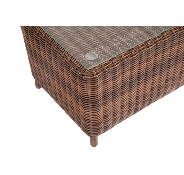 В основе мебели находится алюминиевый каркас высокой прочности. Декоративной составляющей является ручная круглая оплетка, которая выполнена из искусственного ротанга. Столик представлен в шоколадном цвете.