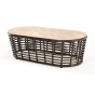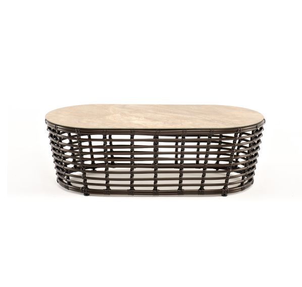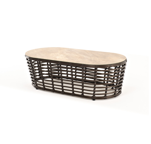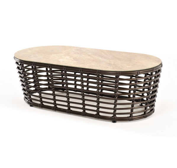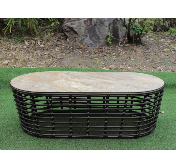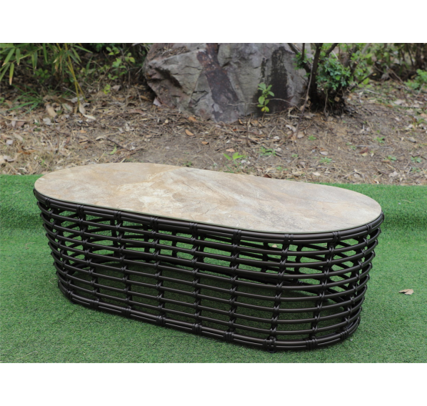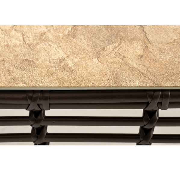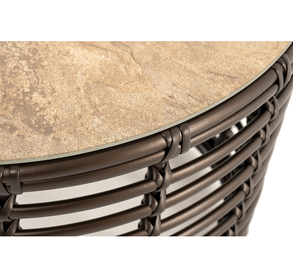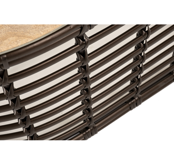 Каркас столика изготовлен из алюминия, вручную оплетенного круглым искусственным ротангом.