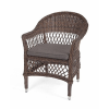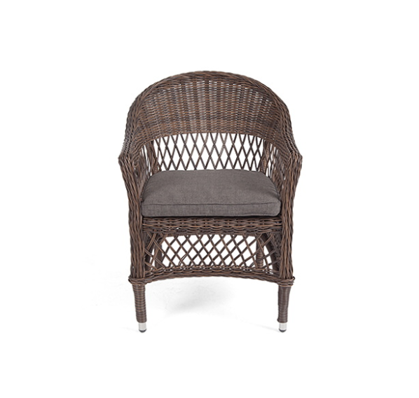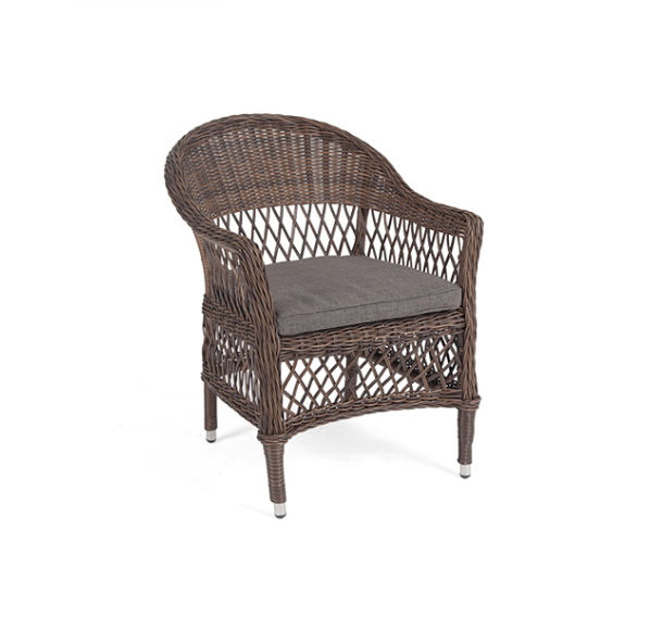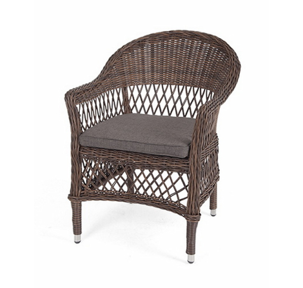 Стул оплетен вручную круглым искусственным ротангом коричневого оттенка. В комплекте представлена мягкая подушка-сиденье серого цвета. Подушка имеет съёмный чехол из полиэстера (100%), плотностью 300гр/м2, с влагоотталкивающей пропиткой.