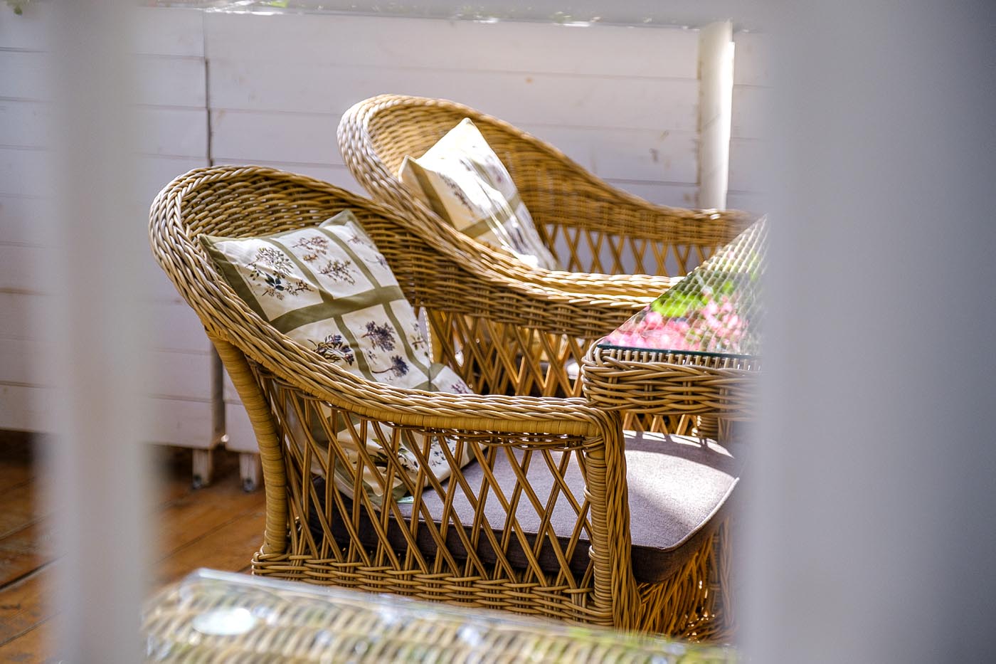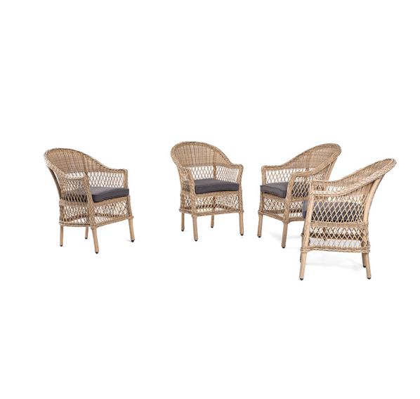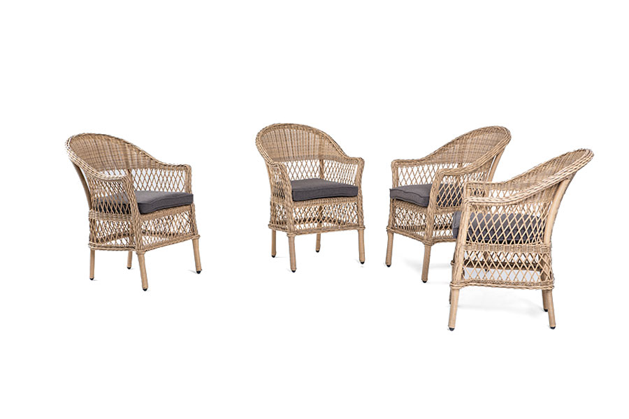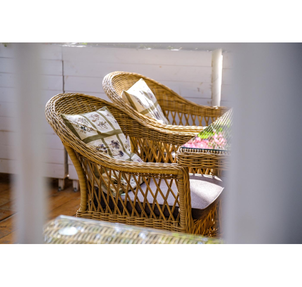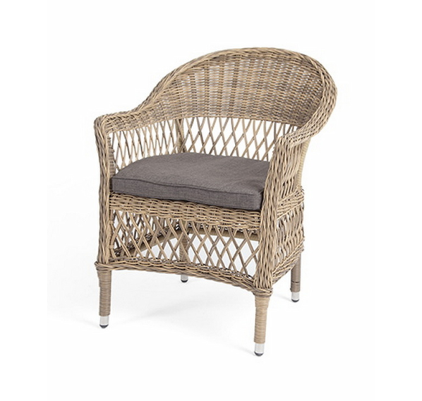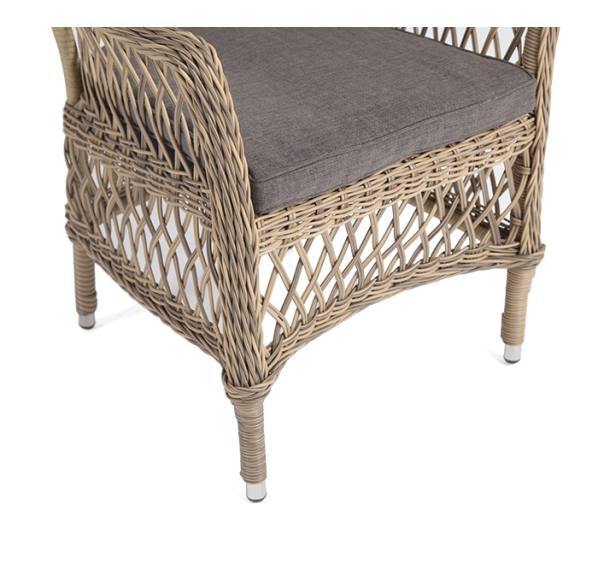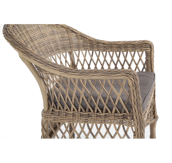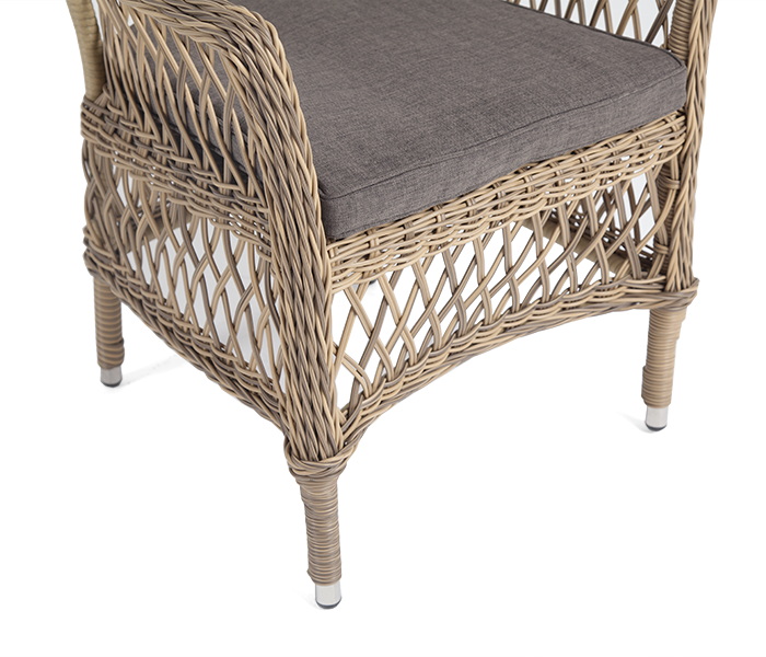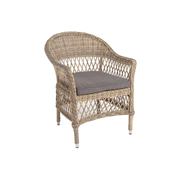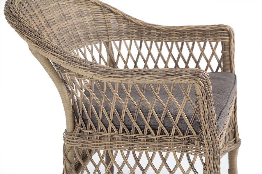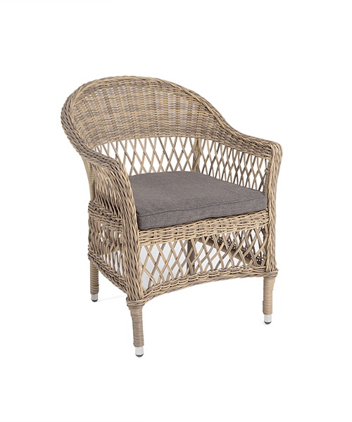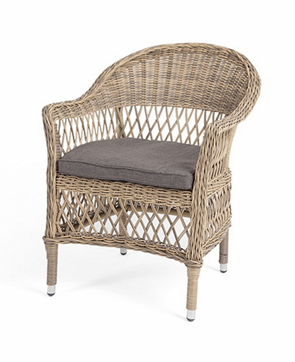 Стул оплетен вручную круглым искусственным ротангом соломенного оттенка. В комплекте представлена мягкая подушка-сиденье серого цвета. Подушка имеет съёмный чехол из полиэстера (100%), плотностью 300гр/м2, с влагоотталкивающей пропиткой.