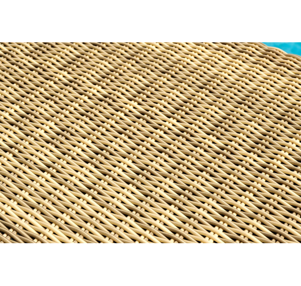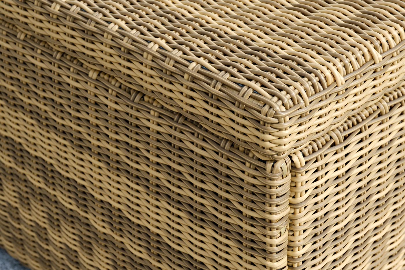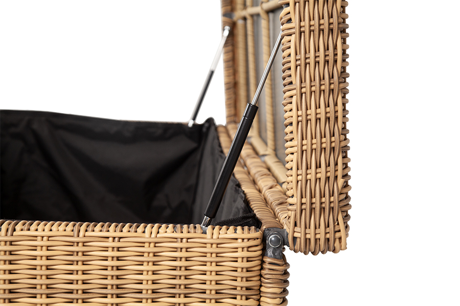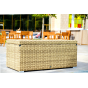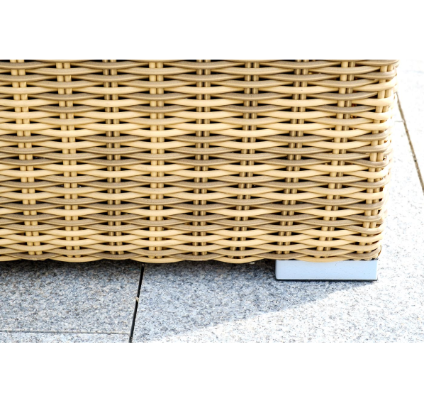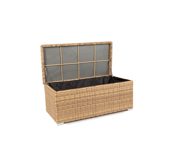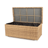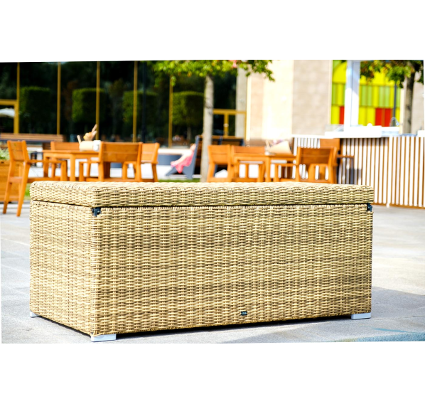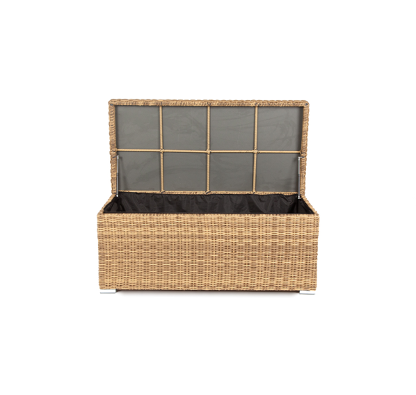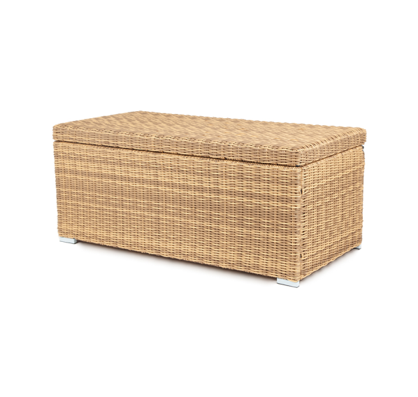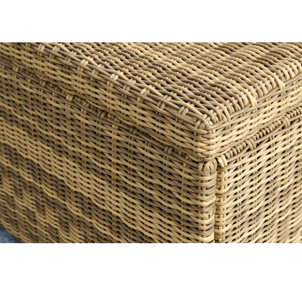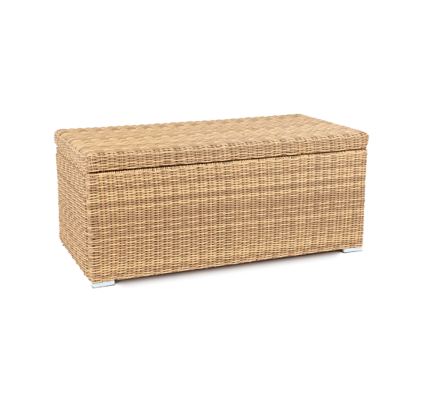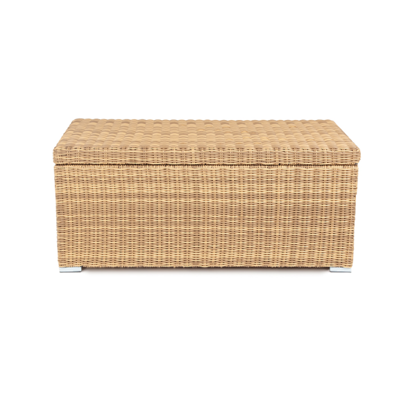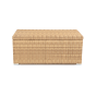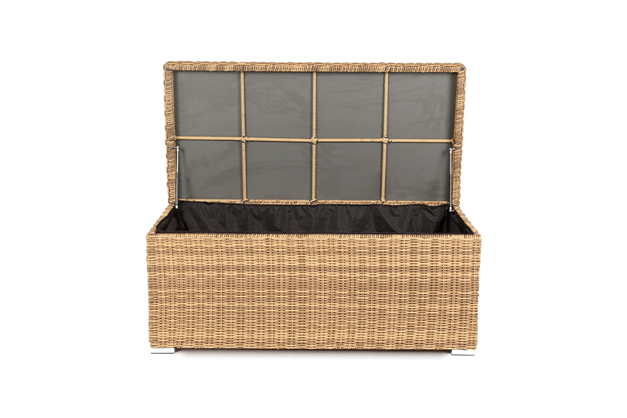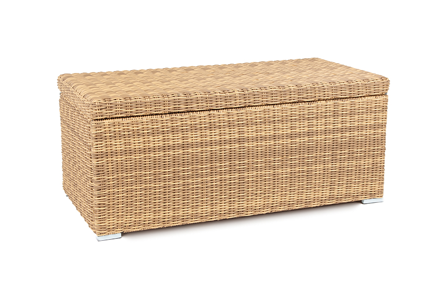 «Порту» вместительный сундук из плоского искусственного ротанга соломенного оттенка. В основе - алюминиевый каркас.