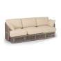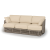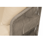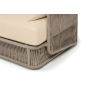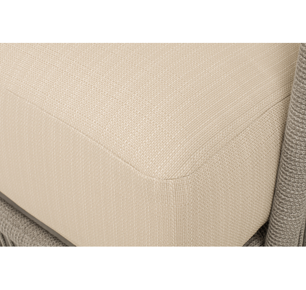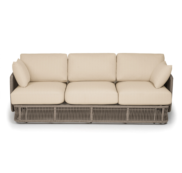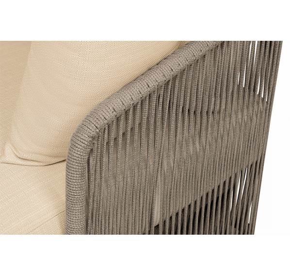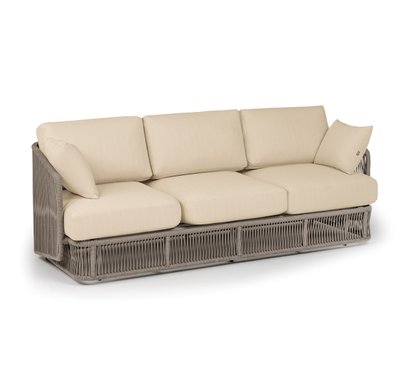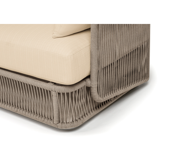 Диван имеет алюминиевый каркас, окрашенный порошковой краской в светло-серый (RAL7035) цвет. Боковины каркаса и спинка вручную оплетены роупом - эластичными синтетическими лентами, изготовленными из высокопрочных полиэфирных волокон. Цвет оплетки - серый меланж.