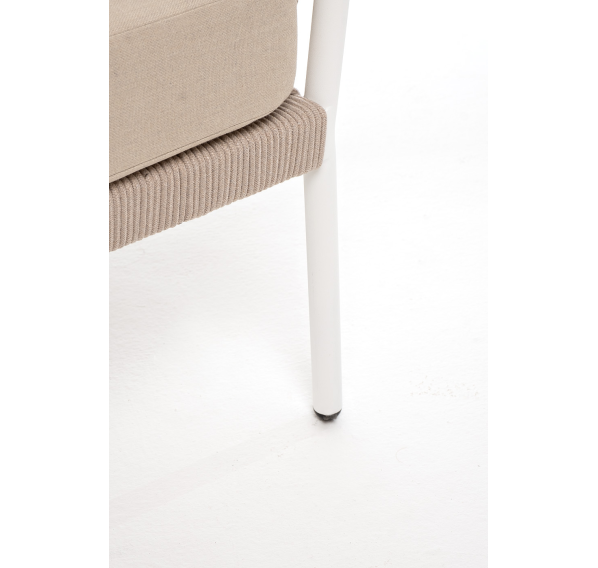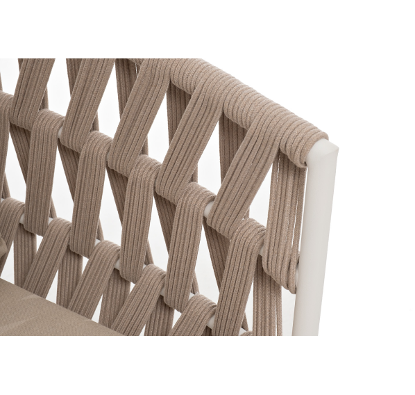 Диван имеет алюминиевый каркас, окрашенный порошковой краской в белый цвет. Боковины каркаса и спинка вручную оплетены роупом - эластичными синтетическими лентами, изготовленными из высокопрочных полиэфирных волокон. Цвет оплетки - бежевый.