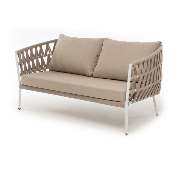 "Диего" диван 2-местный плетеный из роупа, каркас алюминий белый муар, роуп бежевый круглый, ткань бежевая 052
