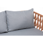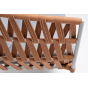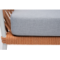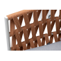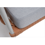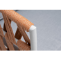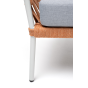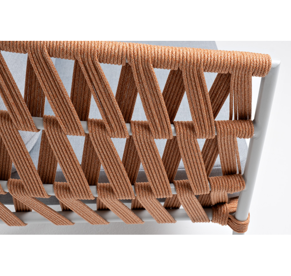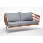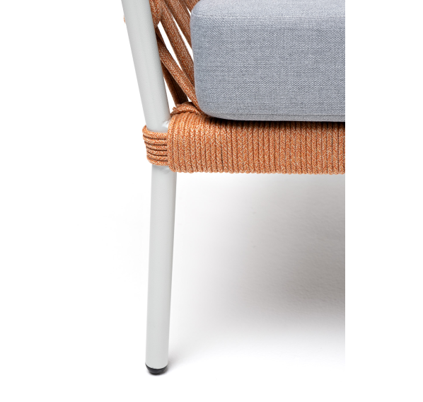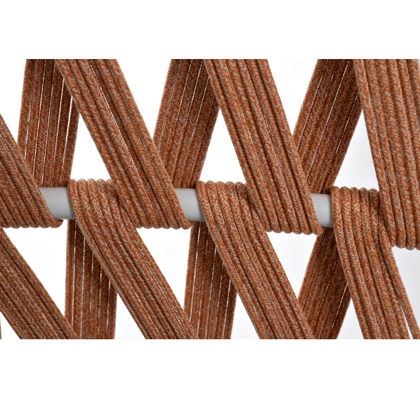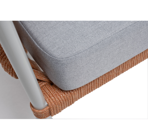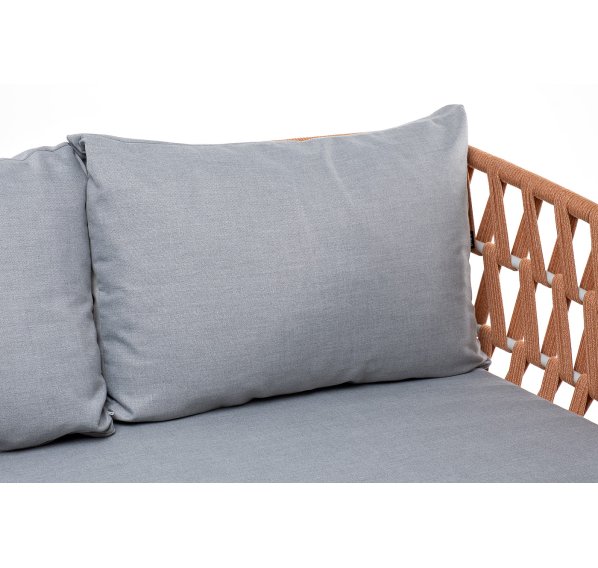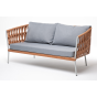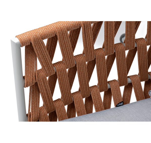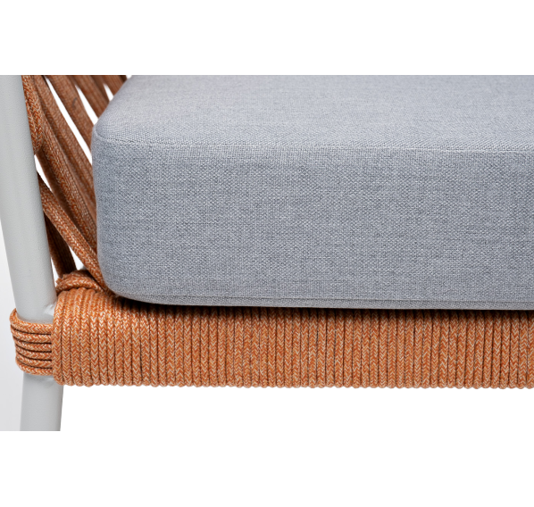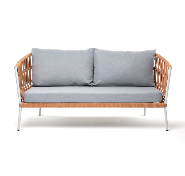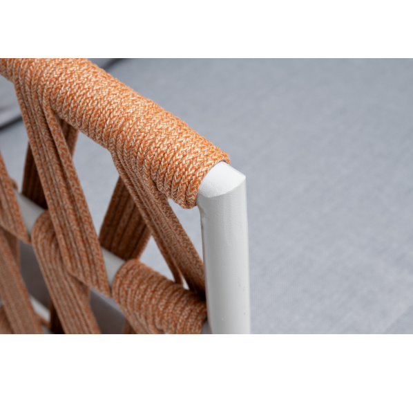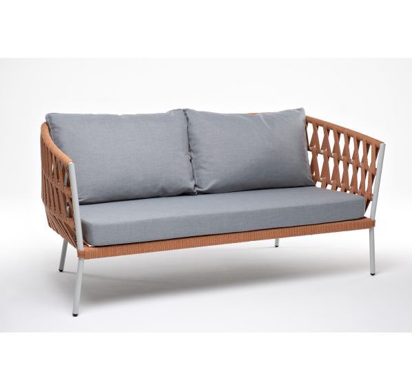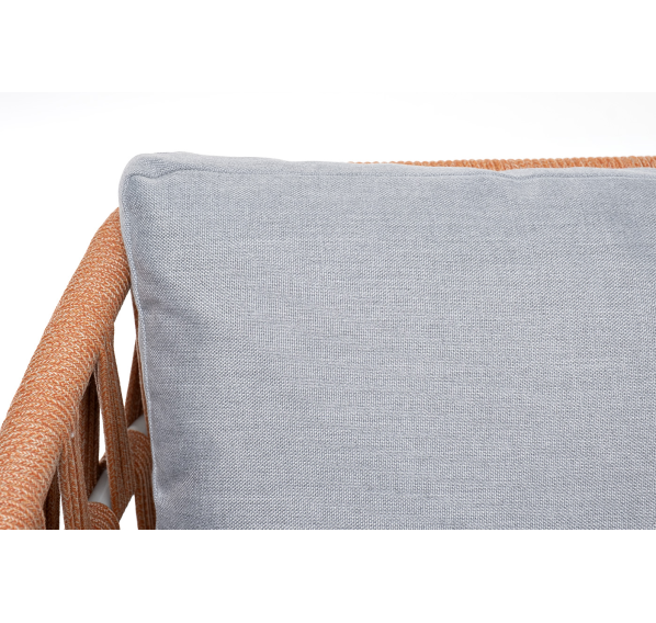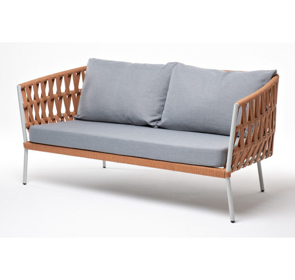 Диван имеет алюминиевый каркас, окрашенный порошковой краской в светло-серый (RAL7035) цвет. Боковины каркаса и спинка вручную оплетены роупом - эластичными синтетическими лентами, изготовленными из высокопрочных полиэфирных волокон. Цвет оплетки - оранжевый меланж.