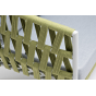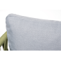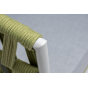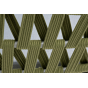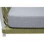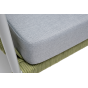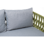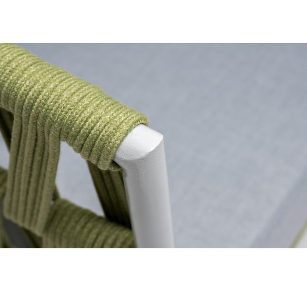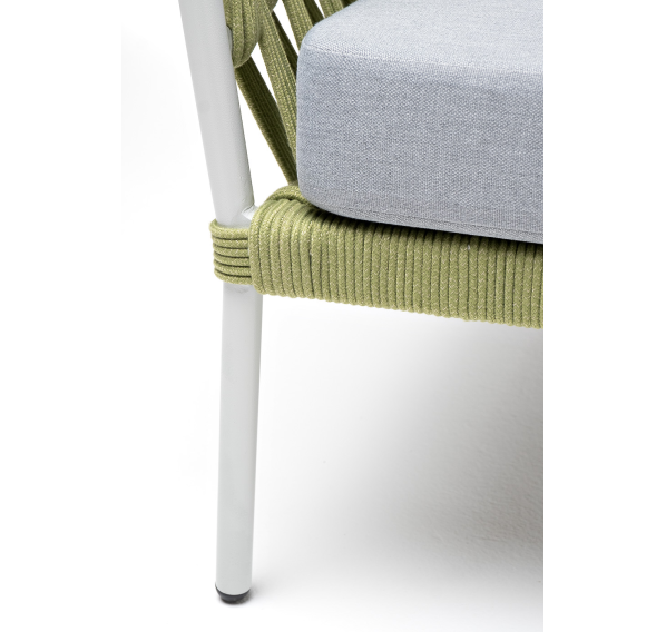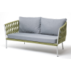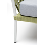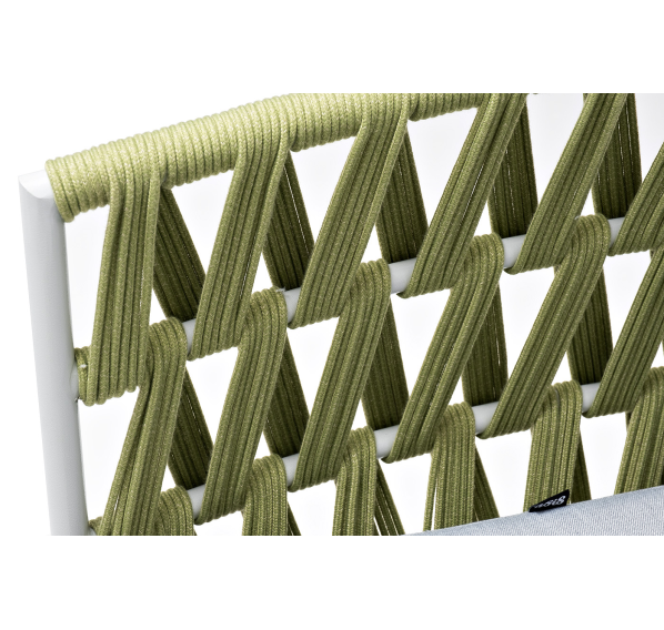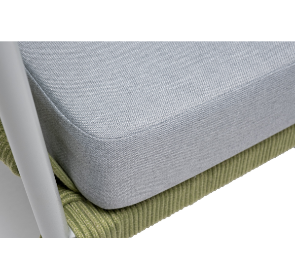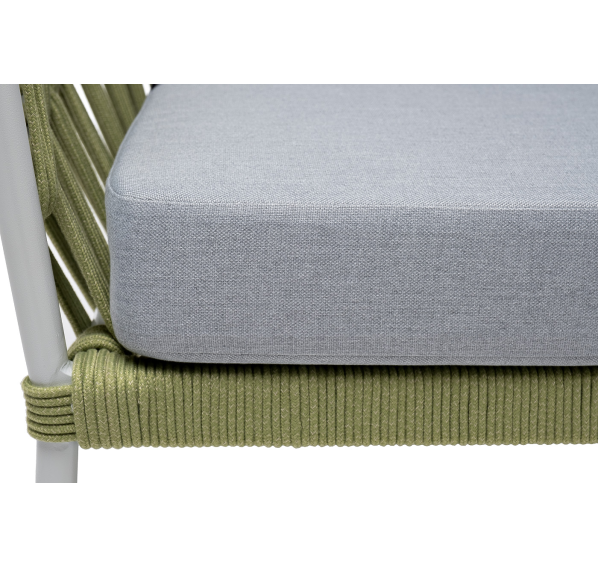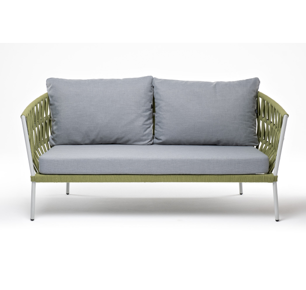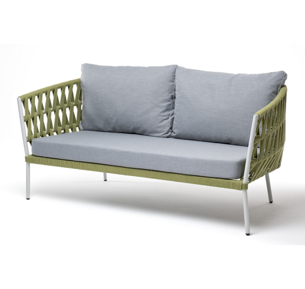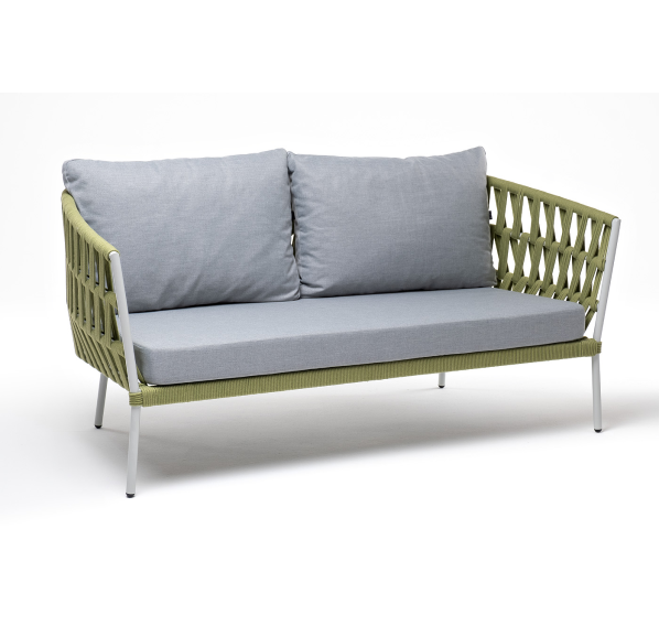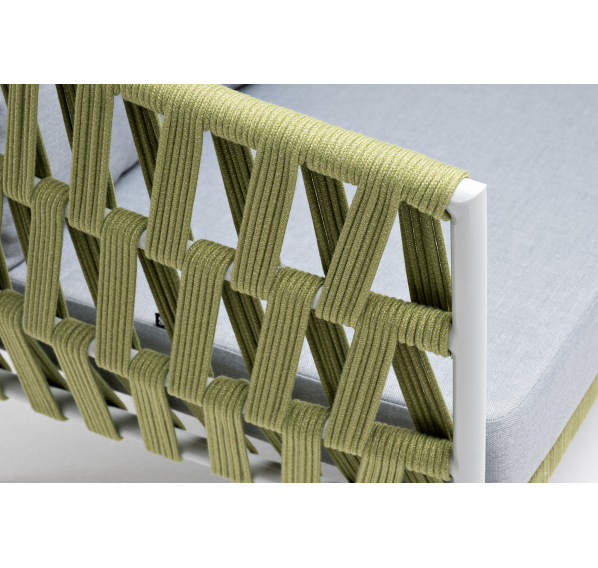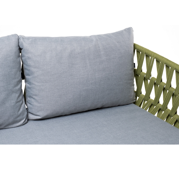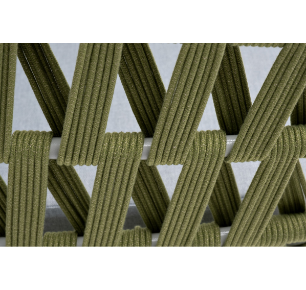 Диван имеет алюминиевый каркас, окрашенный порошковой краской в светло-серый (RAL7035) цвет. Боковины каркаса и спинка вручную оплетены роупом - эластичными синтетическими лентами, изготовленными из высокопрочных полиэфирных волокон. Цвет оплетки - салатовый меланж.