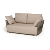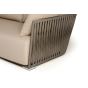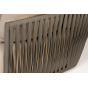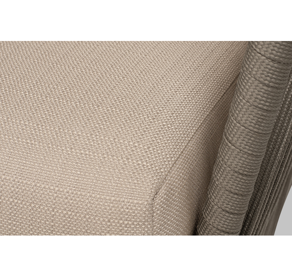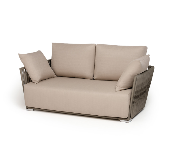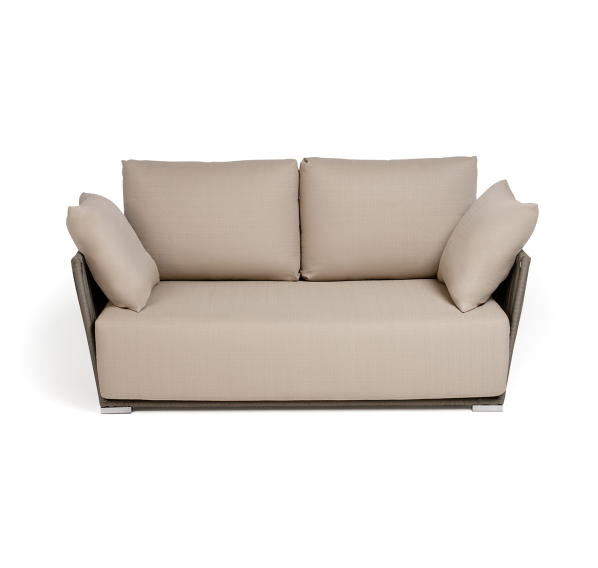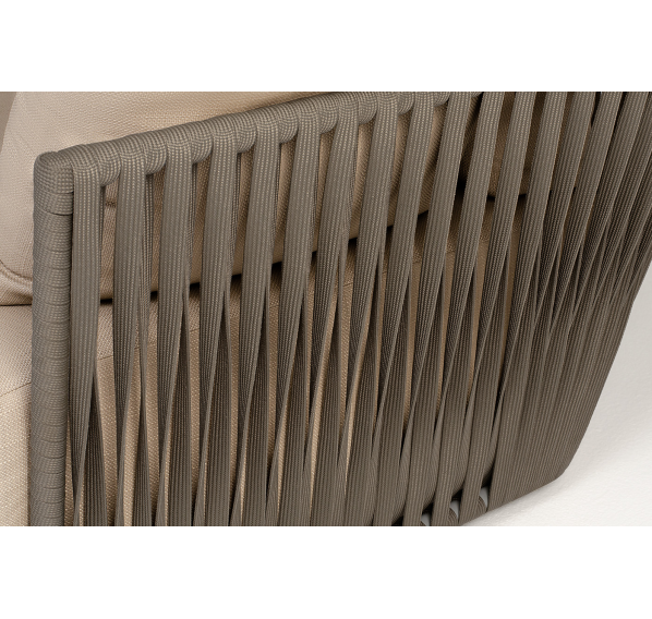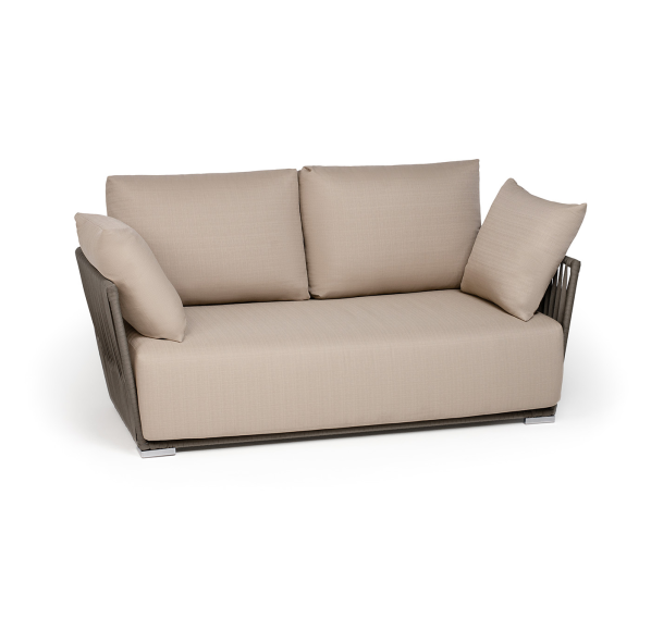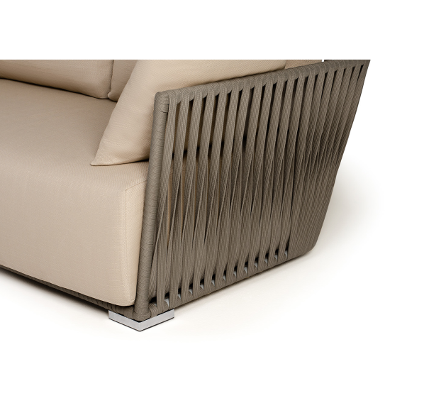Диван имеет алюминиевый каркас, окрашенный порошковой краской в светло-серый (RAL7035) цвет. Боковины каркаса вручную оплетены роупом - эластичными синтетическими лентами, изготовленными из высокопрочных полиэфирных волокон. Цвет оплетки - серо-коричневый.
