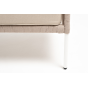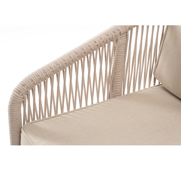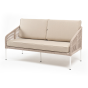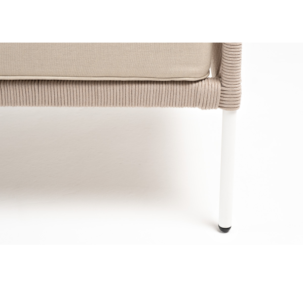 Диван имеет алюминиевый каркас, окрашенный порошковой краской в белый цвет. Боковины каркаса вручную оплетены роупом - эластичными синтетическими лентами, изготовленными из высокопрочных полиэфирных волокон бежевого цвета.
