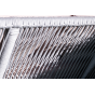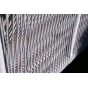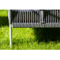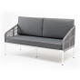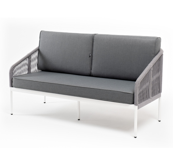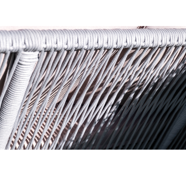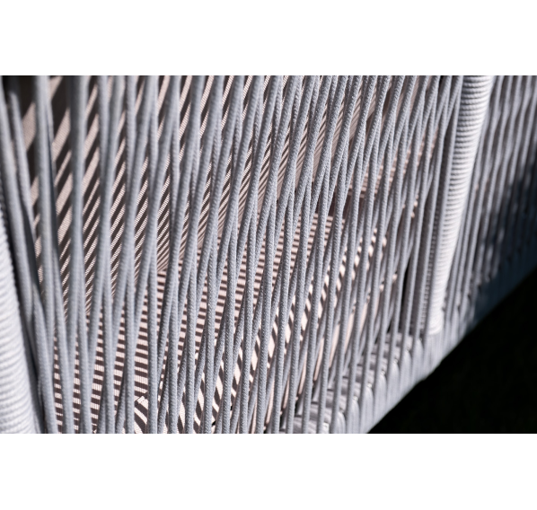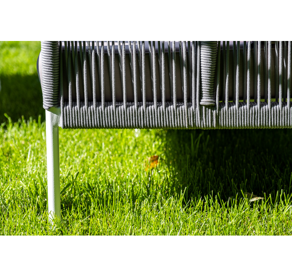 Диван имеет алюминиевый каркас, окрашенный порошковой краской в белый цвет. Боковины каркаса и спинка вручную оплетены роупом - эластичными синтетическими лентами, изготовленными из высокопрочных полиэфирных волокон. Цвет оплетки - светло-серый.