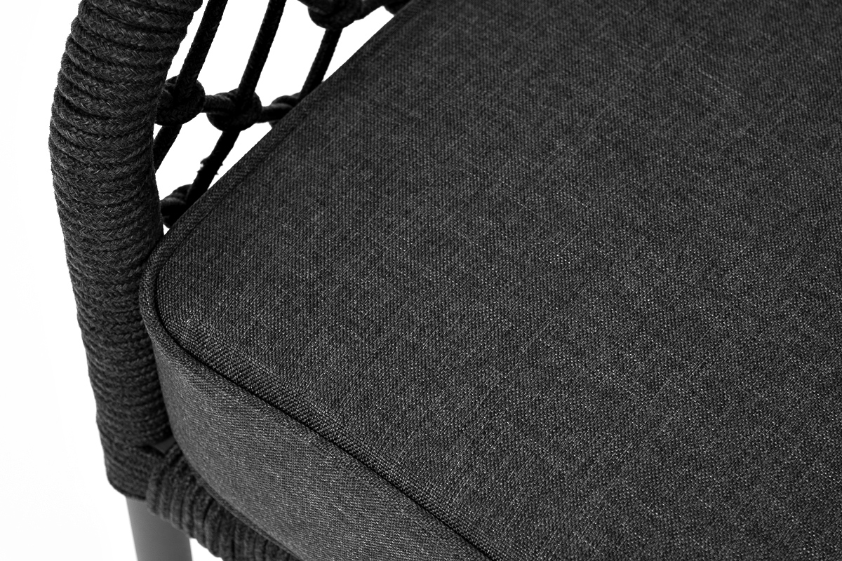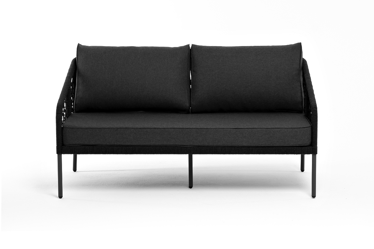 Диван имеет алюминиевый каркас, окрашенный порошковой краской в темно-серый (RAL7024) цвет. Боковины каркаса и спинка вручную оплетены роупом, в плетении «узелки» - эластичными синтетическими лентами, изготовленными из высокопрочных полиэфирных волокон. Цвет оплетки в тон каркасу - темно-серый.