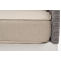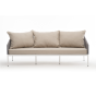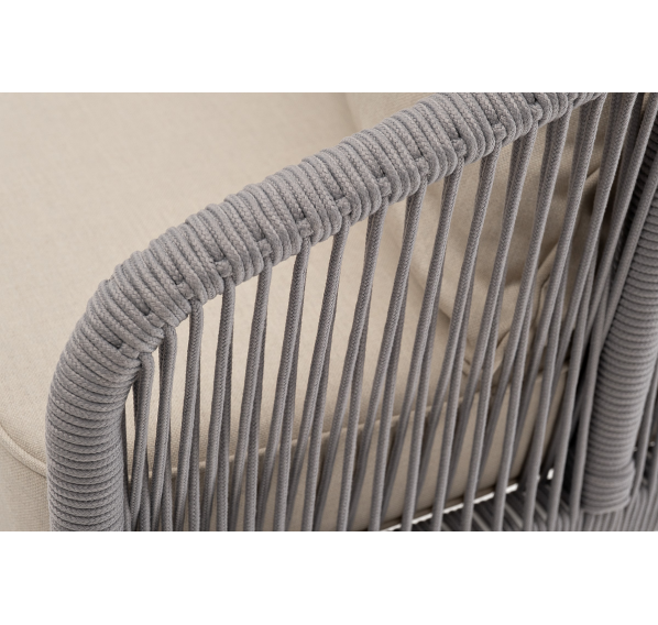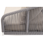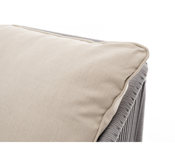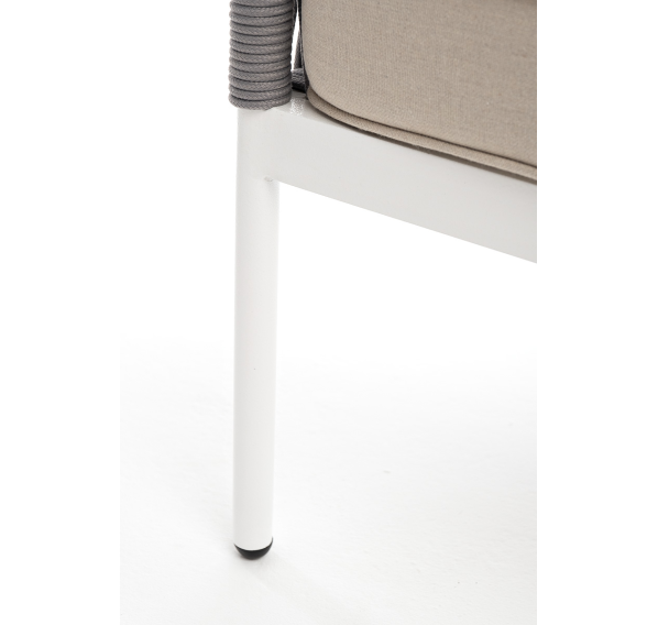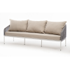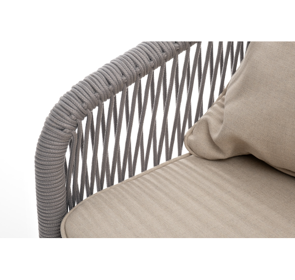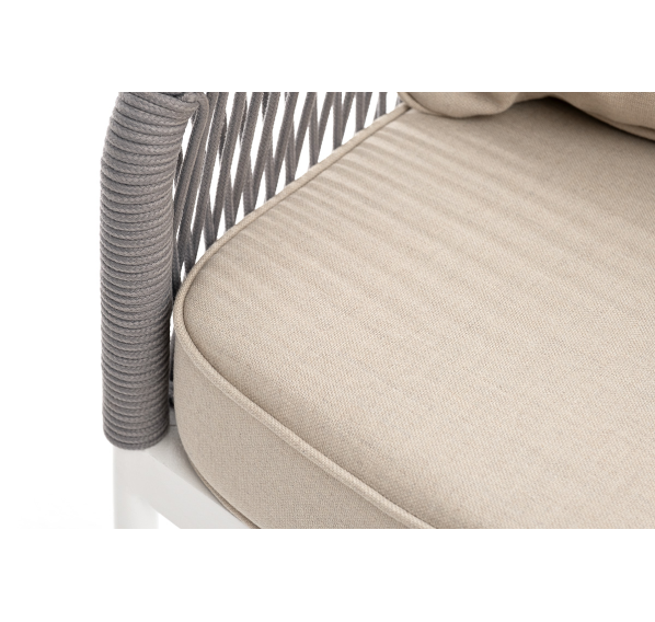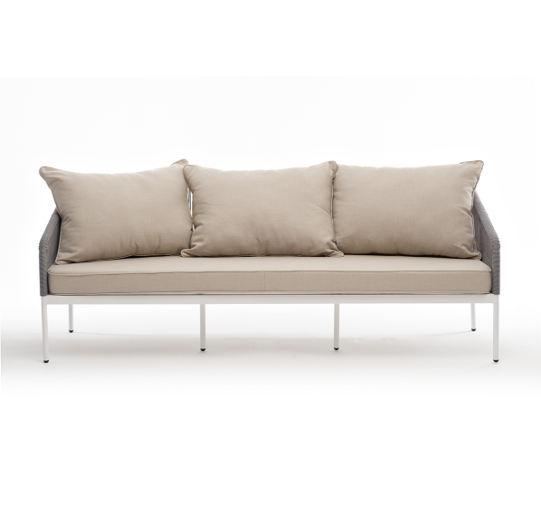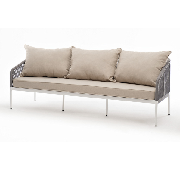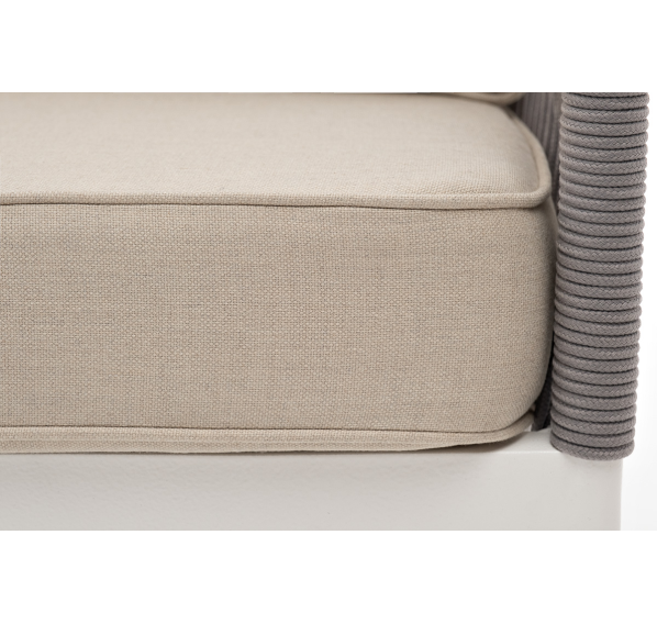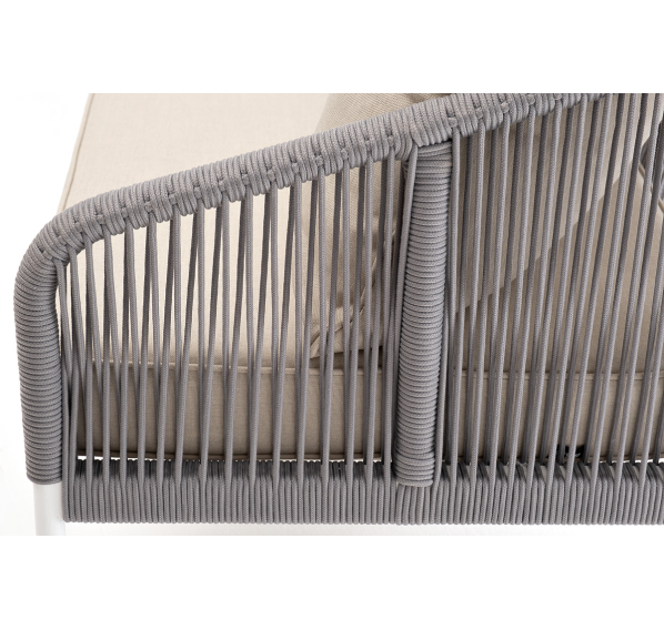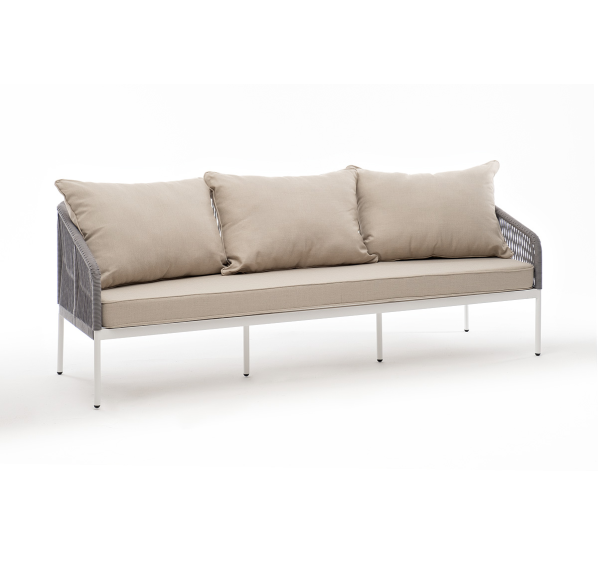 Диван имеет алюминиевый каркас, окрашенный порошковой краской в белый цвет. Боковины каркаса и спинка вручную оплетены роупом - эластичными синтетическими лентами, изготовленными из высокопрочных полиэфирных волокон. Цвет оплетки - светло-серый.