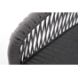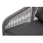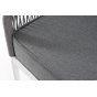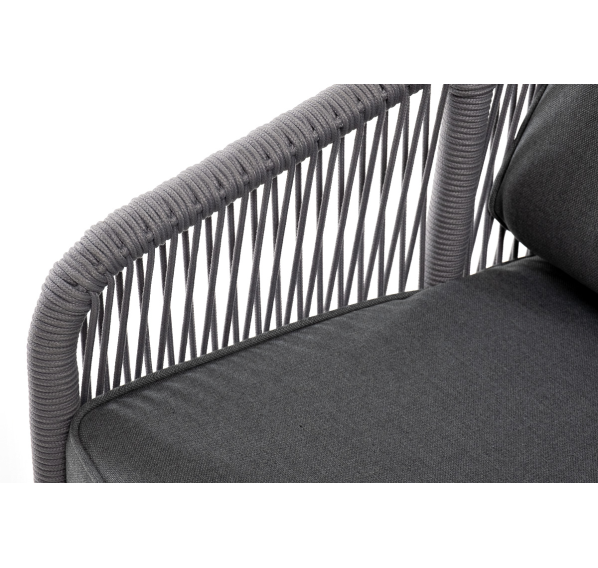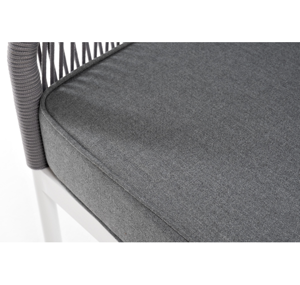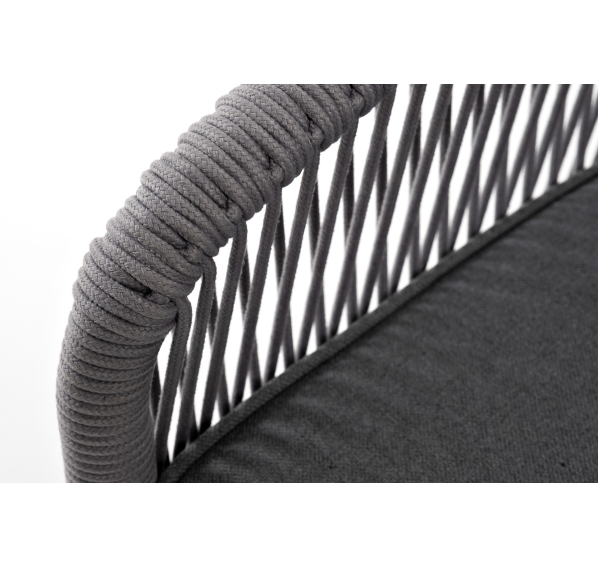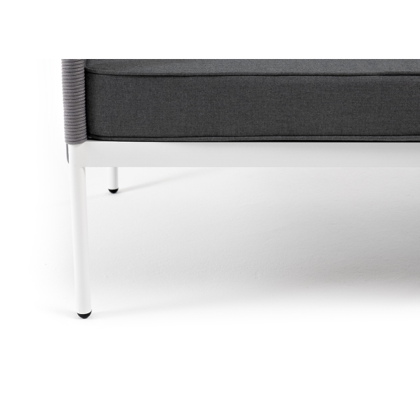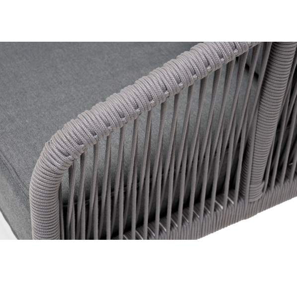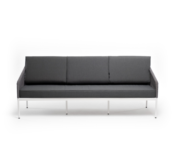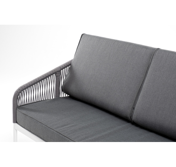 Диван имеет алюминиевый каркас, окрашенный порошковой краской в белый цвет. Боковины каркаса и спинка вручную оплетены роупом - эластичными синтетическими лентами, изготовленными из высокопрочных полиэфирных волокон. Цвет оплетки - светло-серый.
