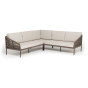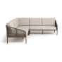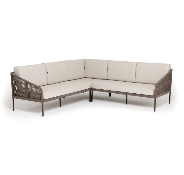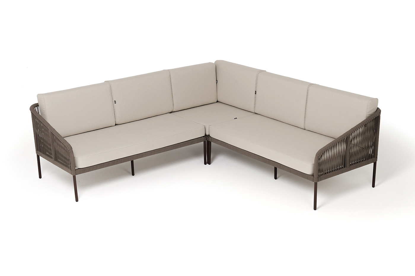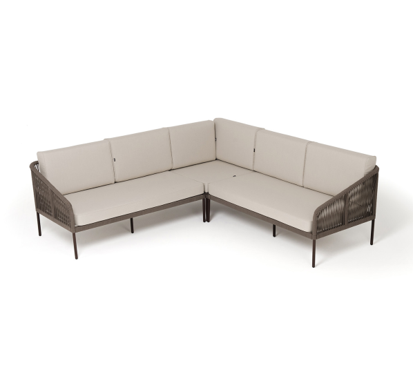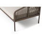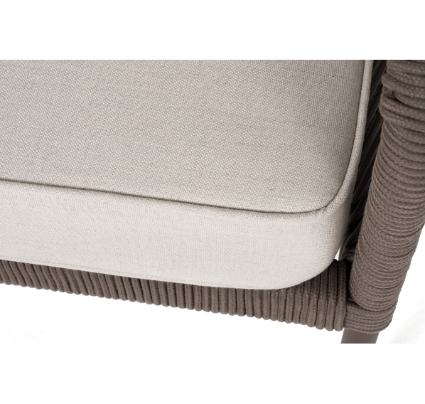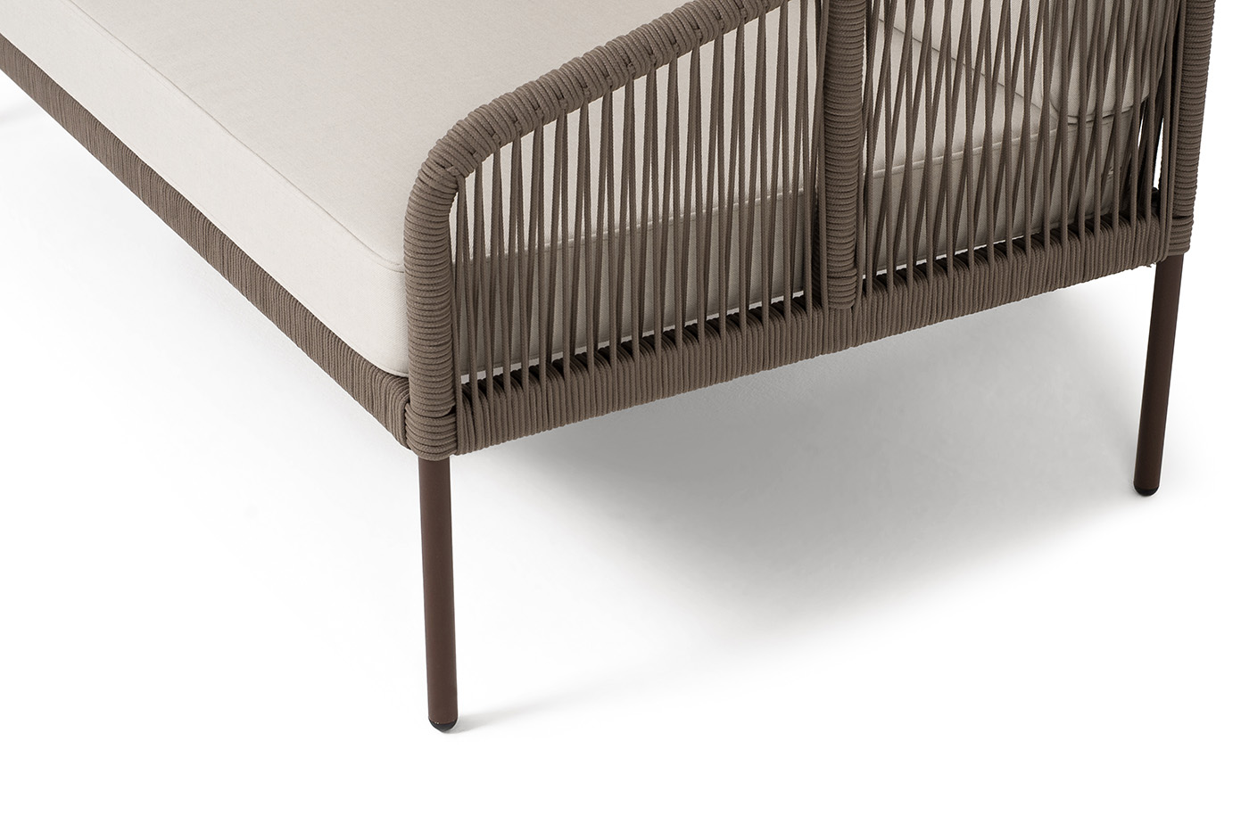 Диван имеет алюминиевый каркас, окрашенный порошковой краской в коричневый (RAL8016) цвет. Боковины каркаса вручную оплетены роупом - эластичными синтетическими лентами, изготовленными из высокопрочных полиэфирных волокон. Цвет оплетки - коричневый.