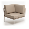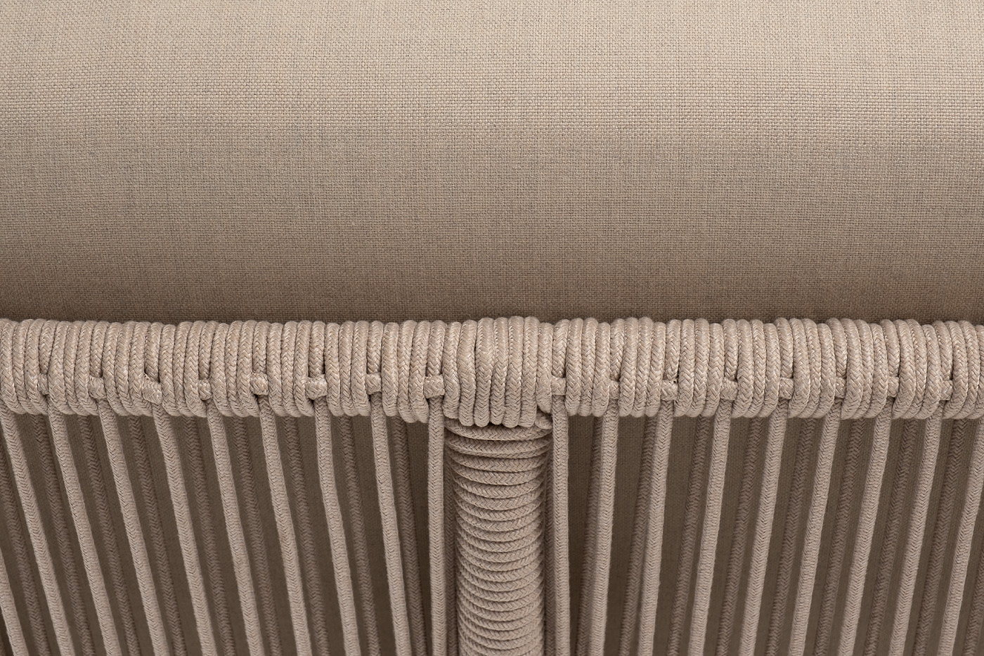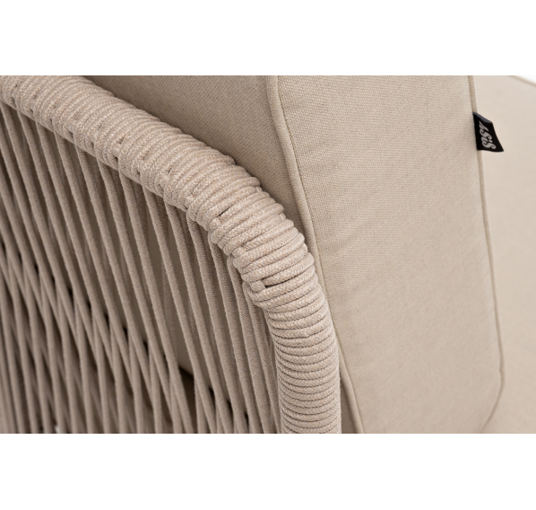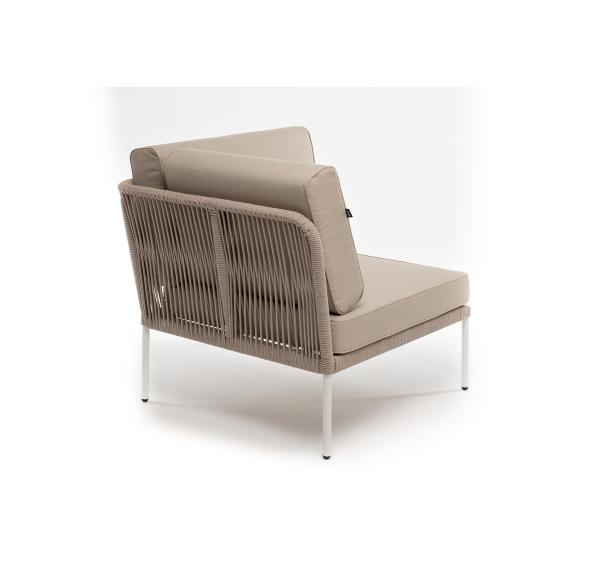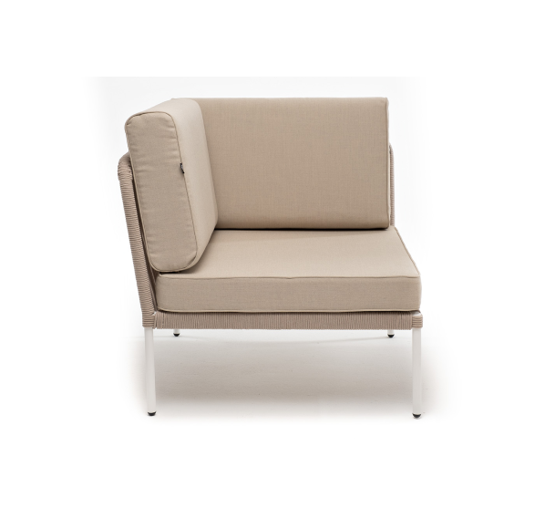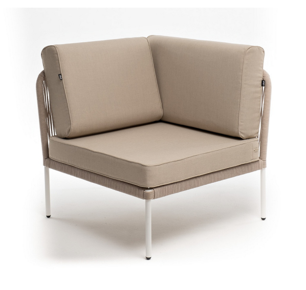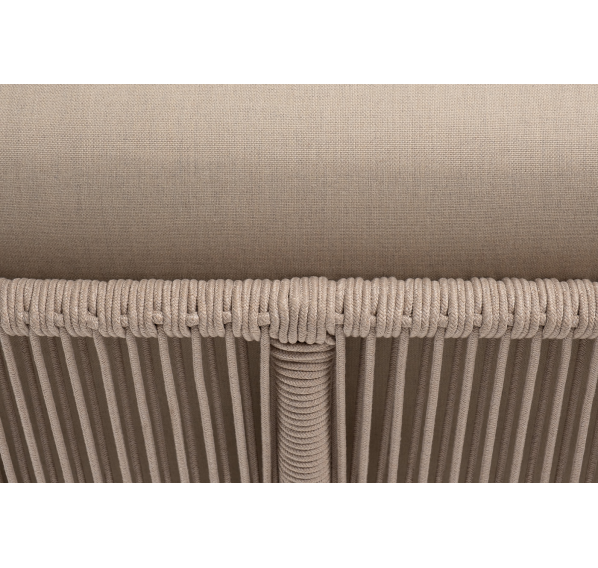 Плетеный модуль имеет алюминиевый каркас, окрашенный порошковой краской в белый цвет. Боковины каркаса вручную оплетены роупом - эластичными синтетическими лентами, изготовленными из высокопрочных полиэфирных волокон. Цвет оплетки - бежевый.