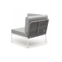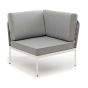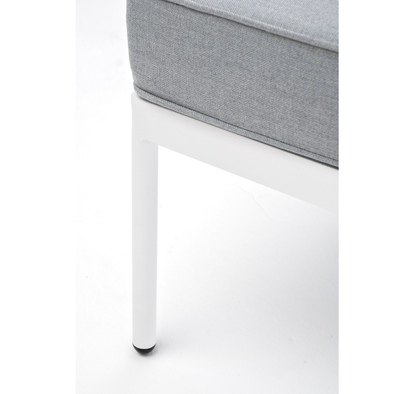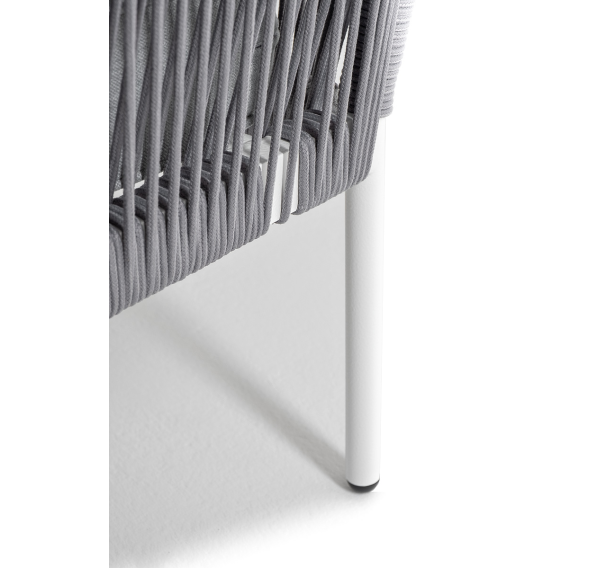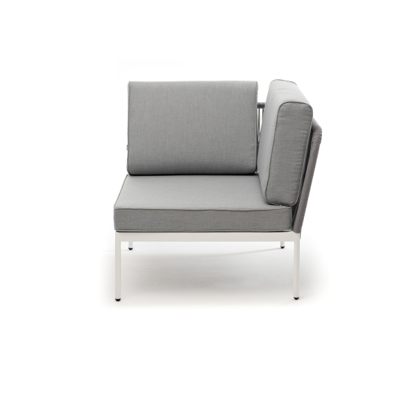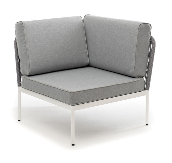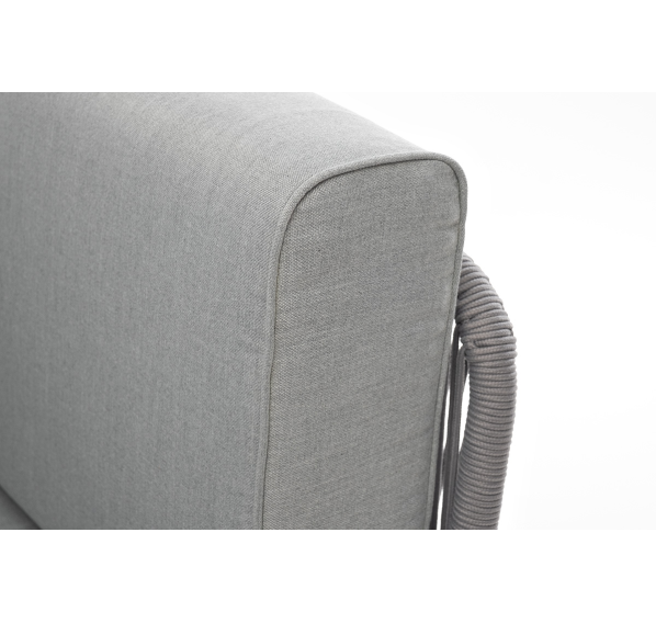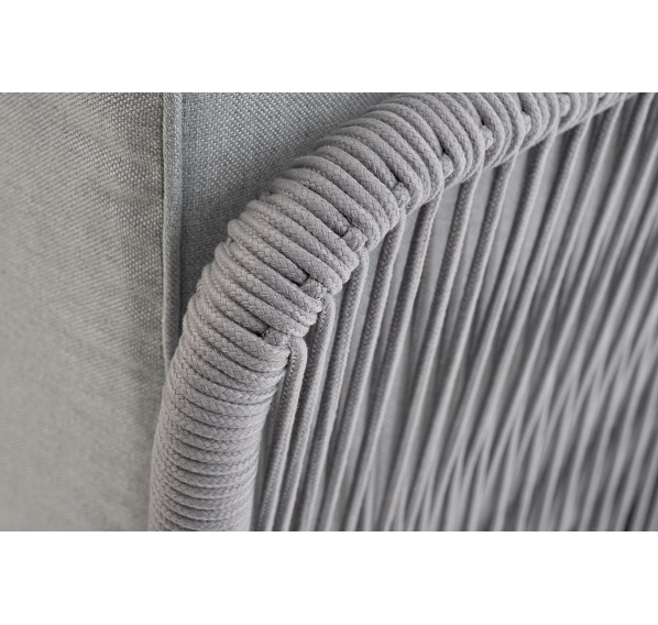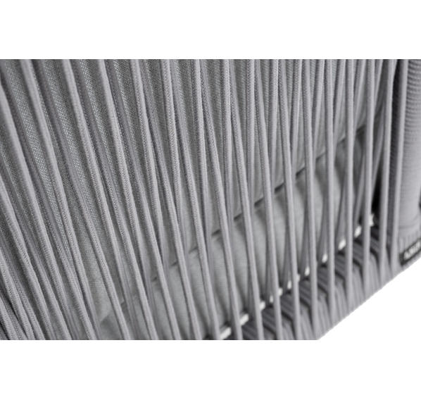 Плетеный модуль имеет алюминиевый каркас, окрашенный порошковой краской в белый цвет. Боковины каркаса вручную оплетены роупом - эластичными синтетическими лентами, изготовленными из высокопрочных полиэфирных волокон. Цвет оплетки - светло-серый.