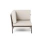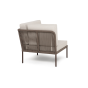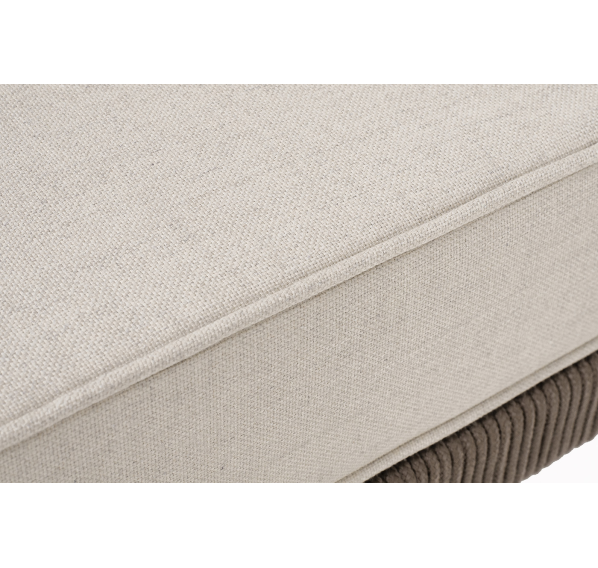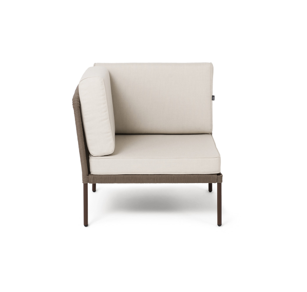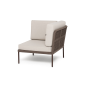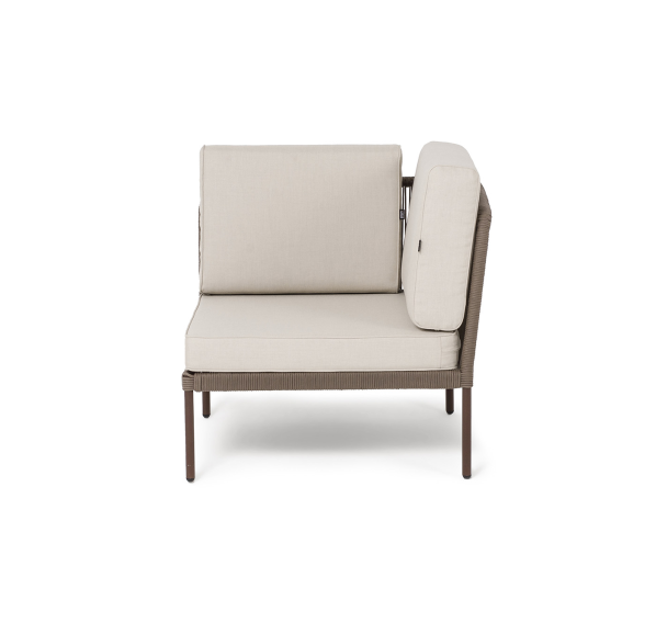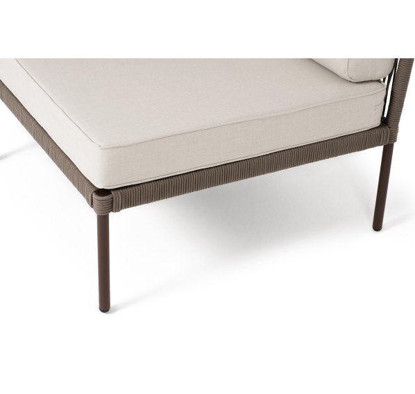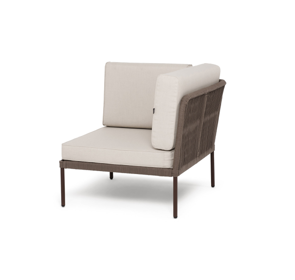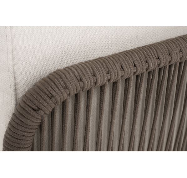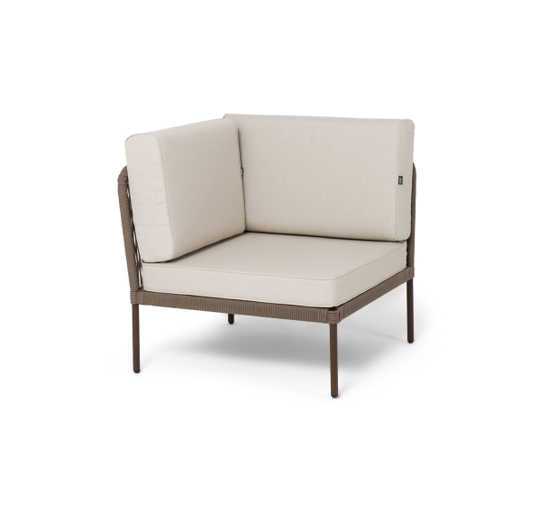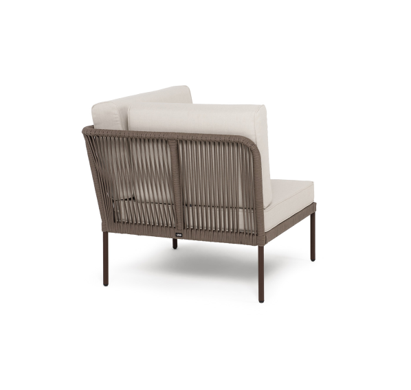 Плетеный модуль имеет алюминиевый каркас, окрашенный порошковой краской в коричневый (RAL8016) цвет. Боковины каркаса вручную оплетены роупом - эластичными синтетическими лентами, изготовленными из высокопрочных полиэфирных волокон. Цвет оплетки - коричневый.