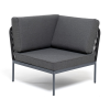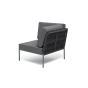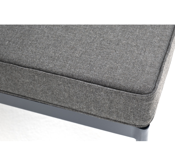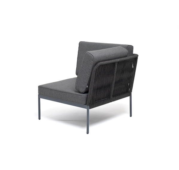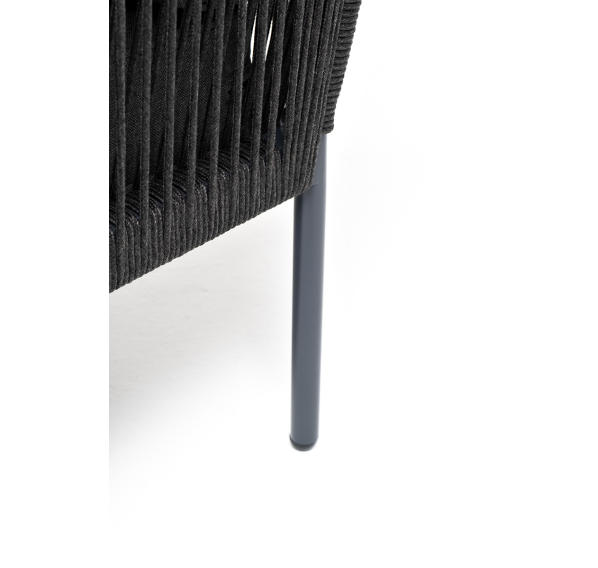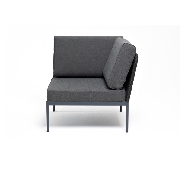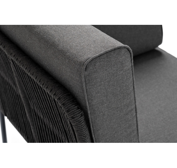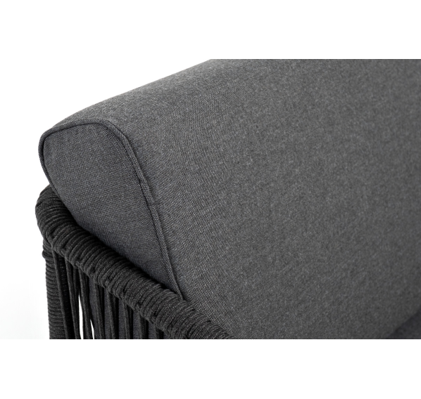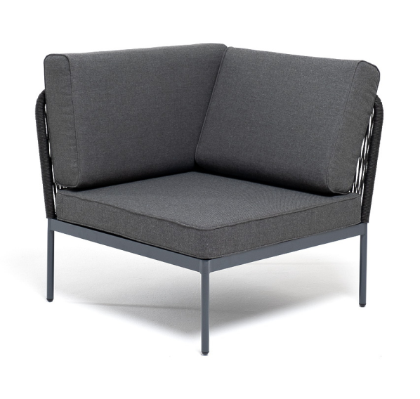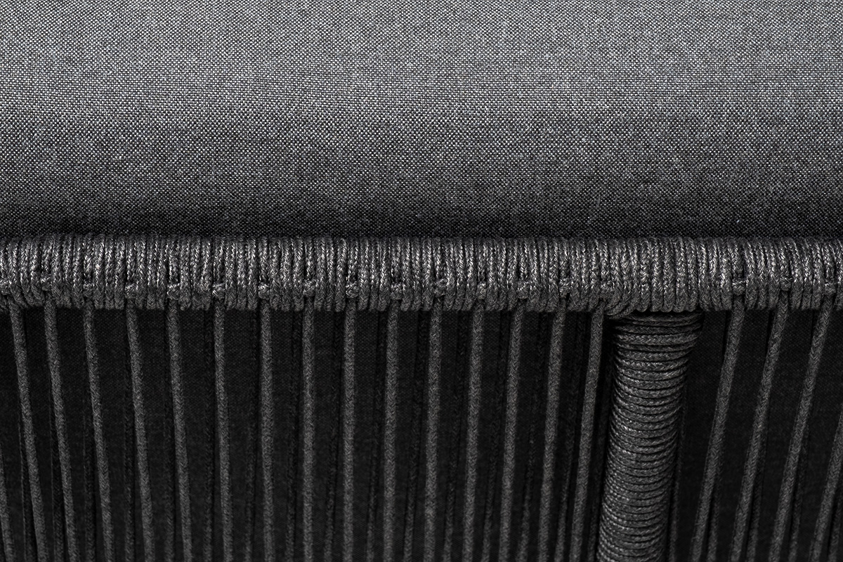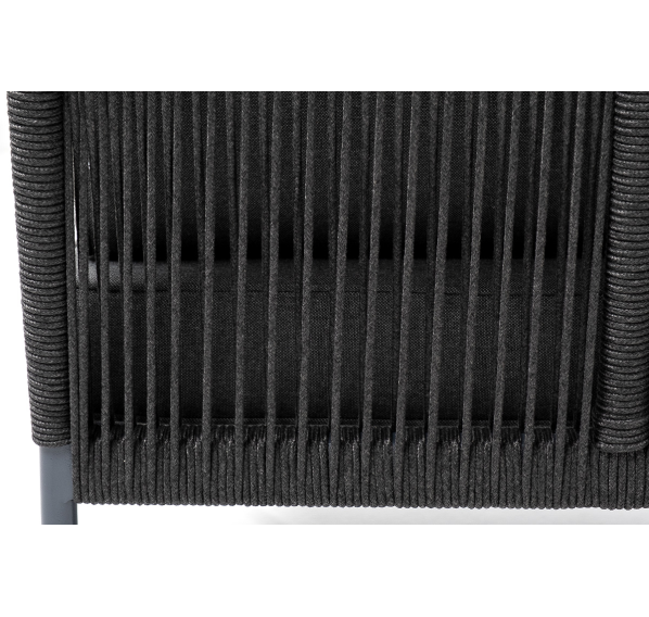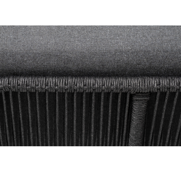Плетеный модуль имеет алюминиевый каркас, окрашенный порошковой краской в темно-серый (RAL7024) цвет. Боковины каркаса вручную оплетены роупом - эластичными синтетическими лентами, изготовленными из высокопрочных полиэфирных волокон. Цвет оплетки - темно-серый.