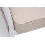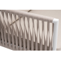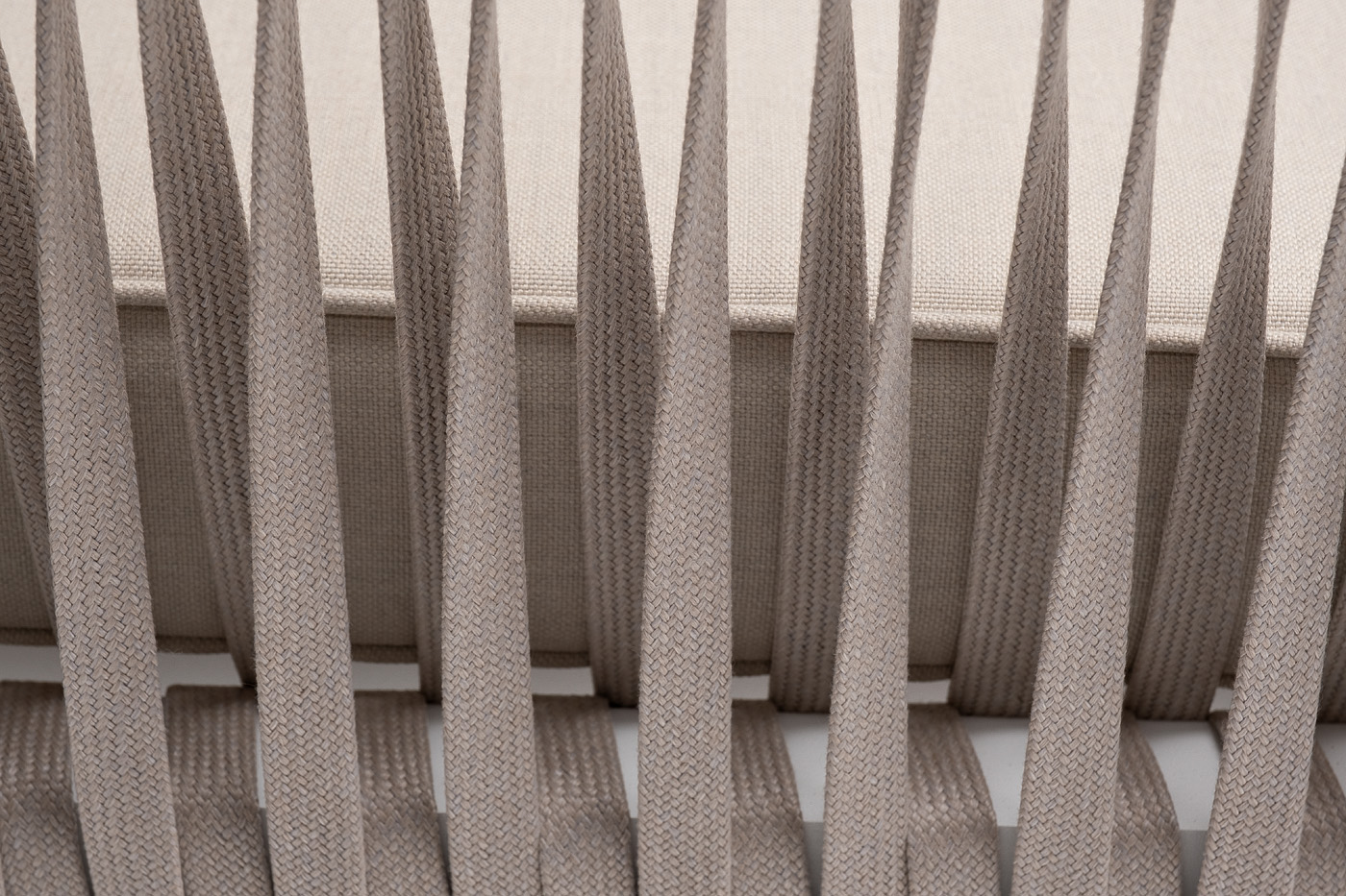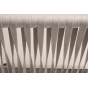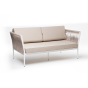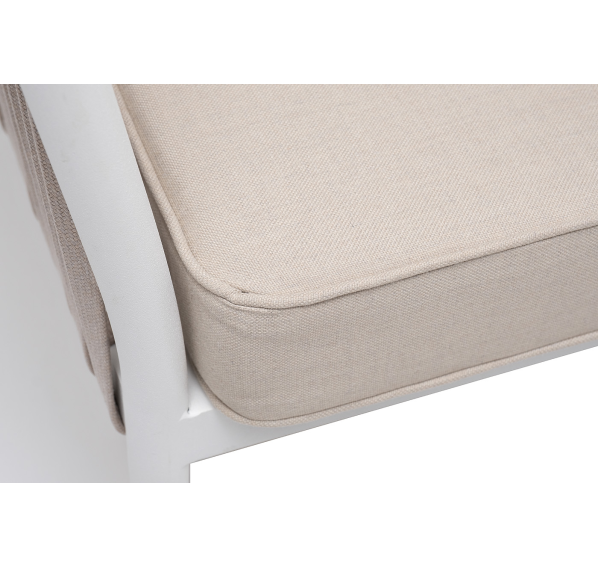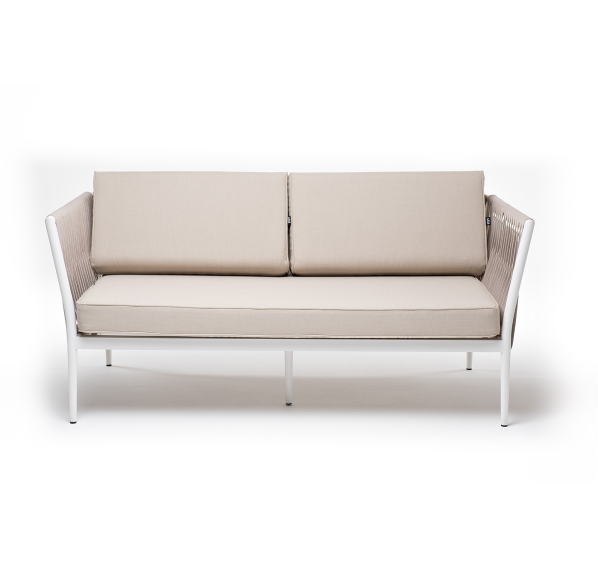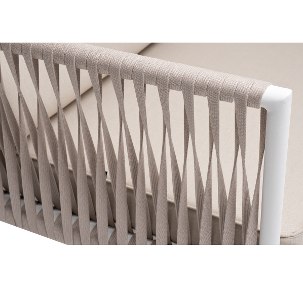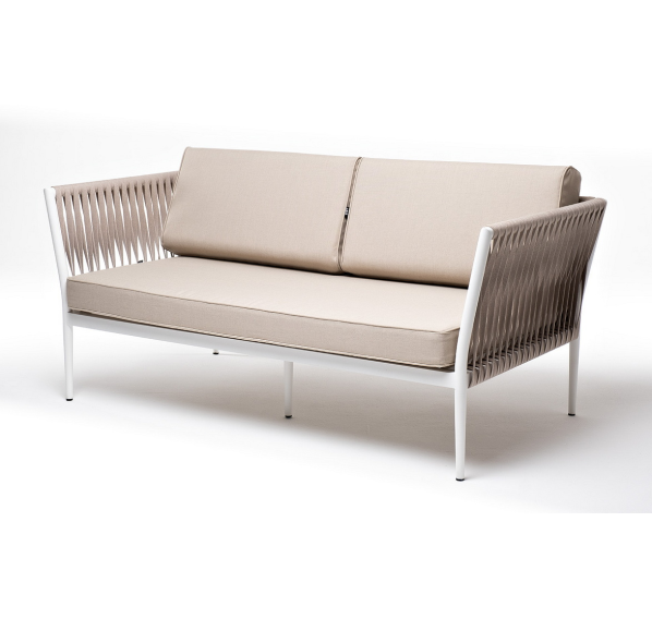 Диван имеет алюминиевый каркас, окрашенный порошковой краской в белый цвет. Боковины каркаса вручную оплетены роупом - эластичными синтетическими лентами, изготовленными из высокопрочных полиэфирных волокон. Цвет оплетки - бежевый.