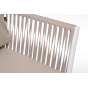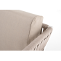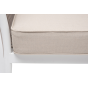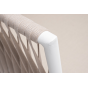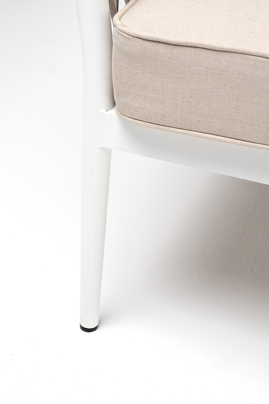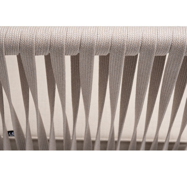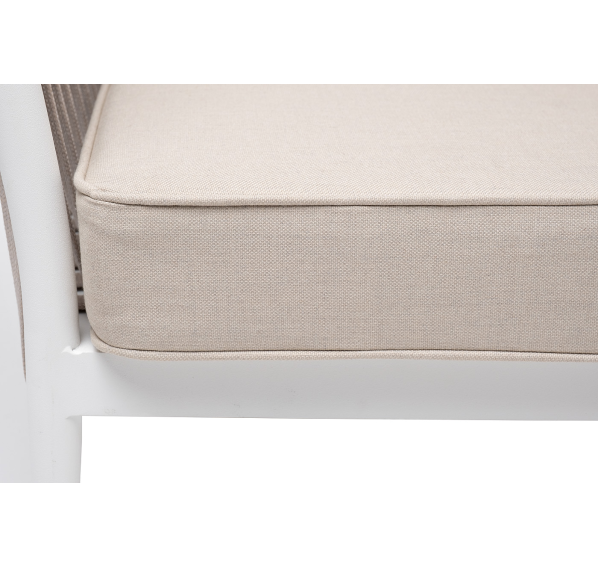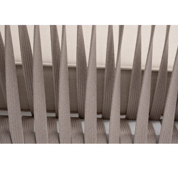 Диван имеет алюминиевый каркас, окрашенный порошковой краской в белый цвет. Боковины каркаса вручную оплетены роупом - эластичными синтетическими лентами, изготовленными из высокопрочных полиэфирных волокон. Цвет оплетки - бежевый.