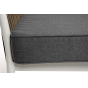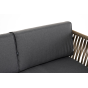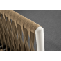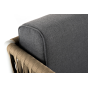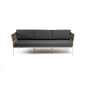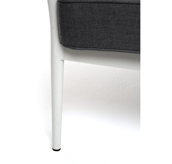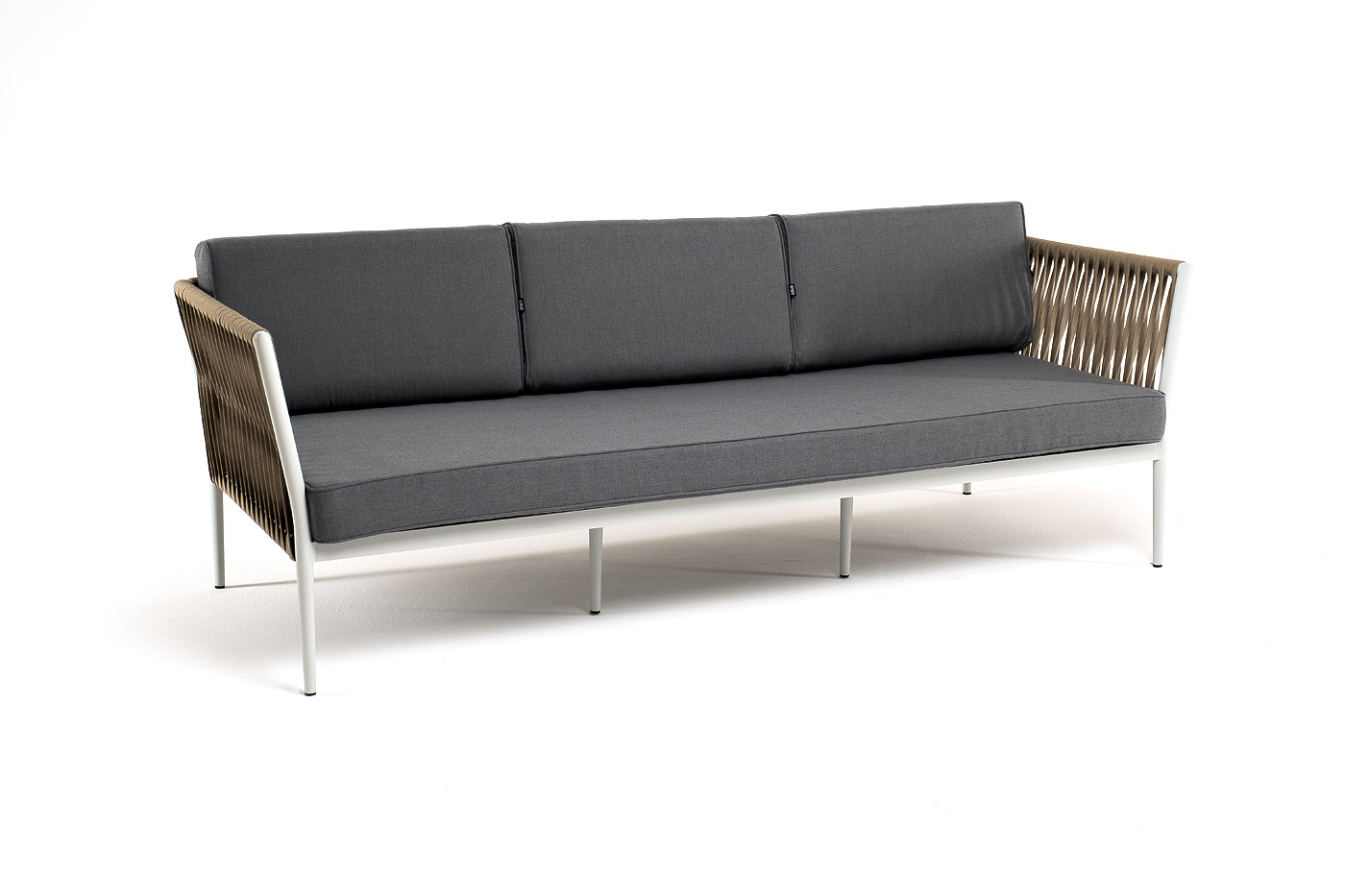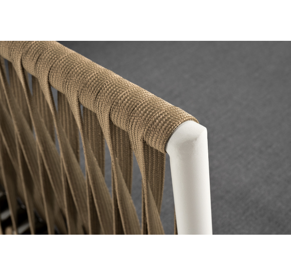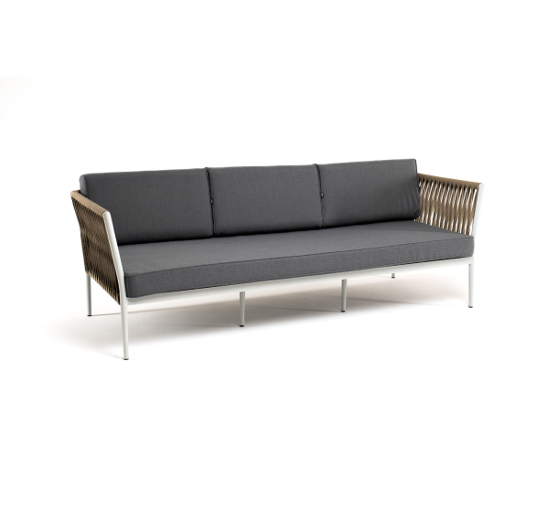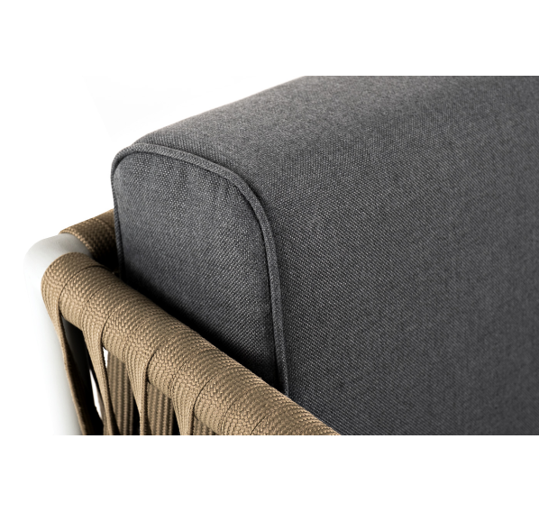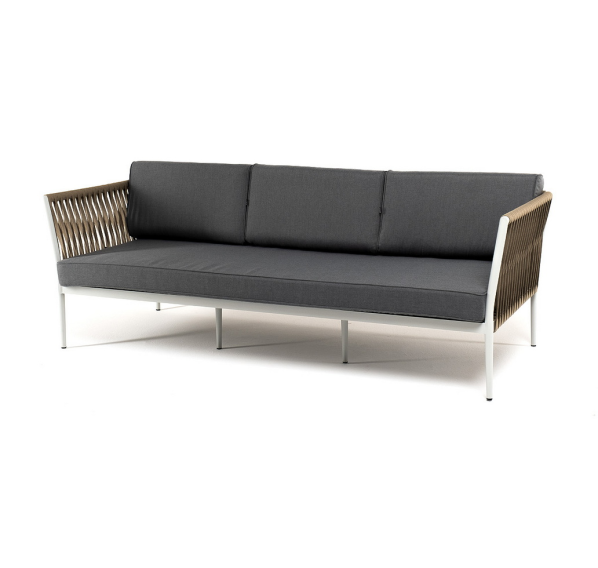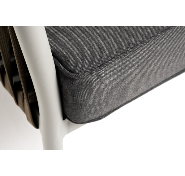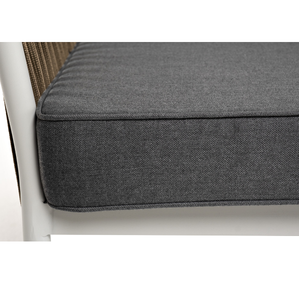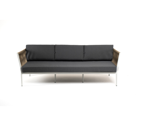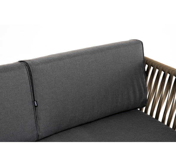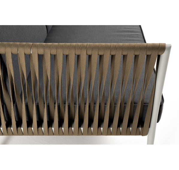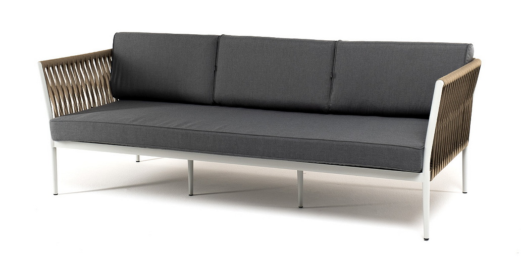 Диван имеет алюминиевый каркас, окрашенный порошковой краской в светло-серый (RAL7035) цвет. Боковины каркаса вручную оплетены роупом - эластичными синтетическими лентами, изготовленными из высокопрочных полиэфирных волокон. Цвет оплетки - серо-коричневый.