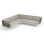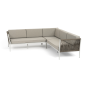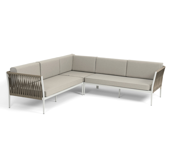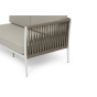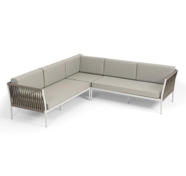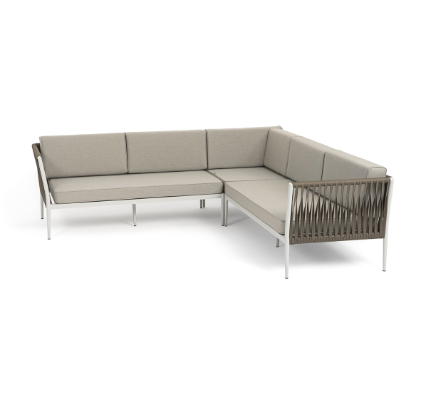 Диван имеет алюминиевый каркас, окрашенный порошковой краской в светло-серый (RAL7035) цвет. Боковины каркаса вручную оплетены плоским роупом - эластичными синтетическими лентами, изготовленными из высокопрочных полиэфирных волокон. Цвет оплетки - серо-коричневый.