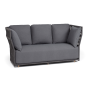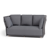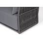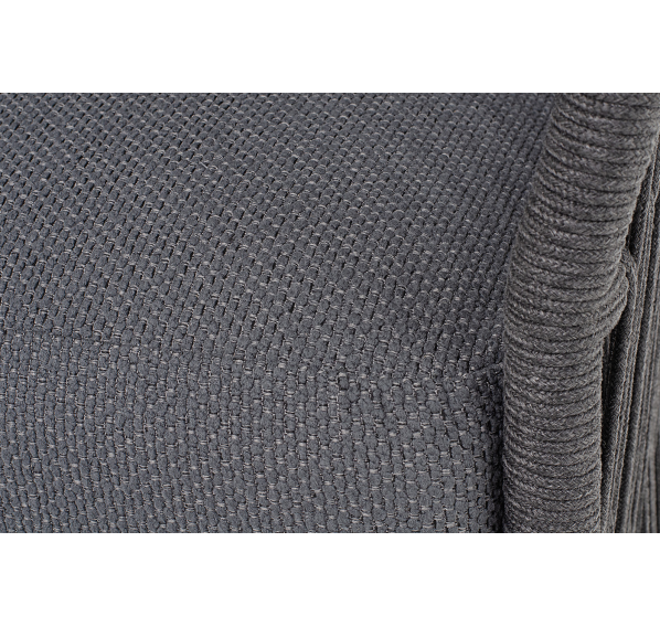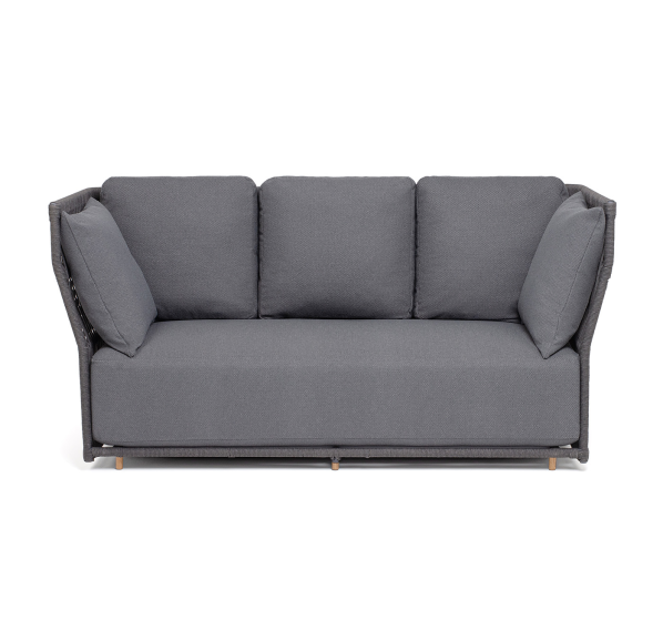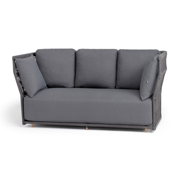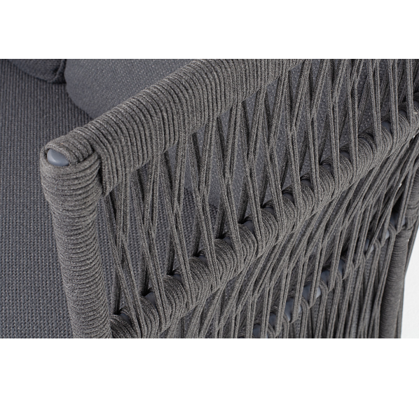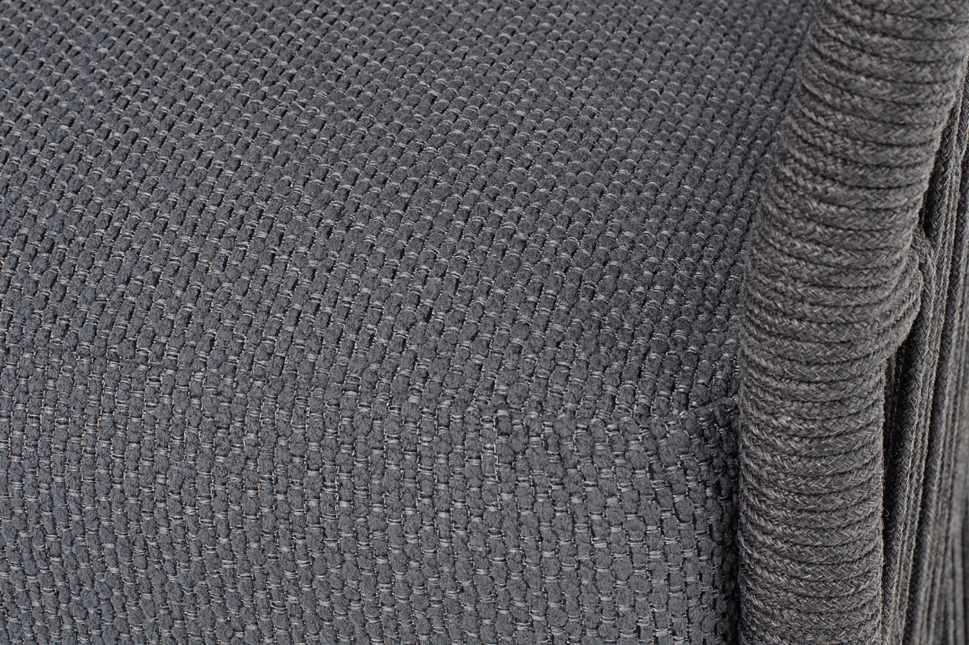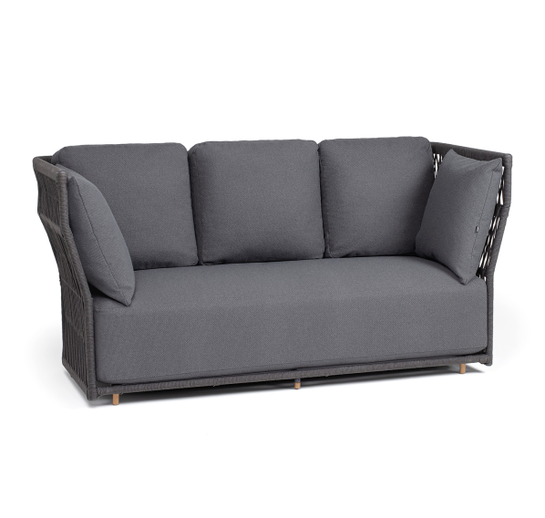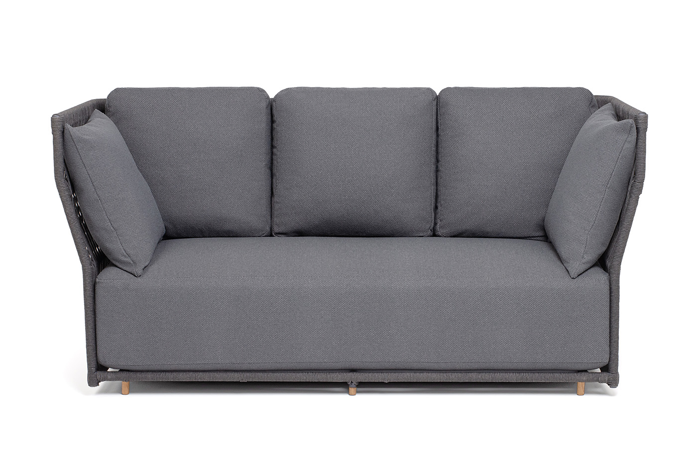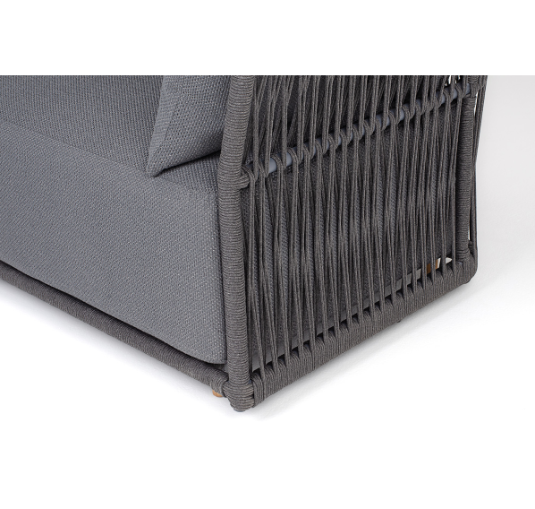 Диван имеет алюминиевый каркас, окрашенный порошковой краской в темно-серый (RAL7024) цвет. Боковины каркаса и спинка вручную оплетены роупом - эластичными синтетическими лентами, изготовленными из высокопрочных полиэфирных волокон. Цвет оплетки в тон каркасу - темно-серый.