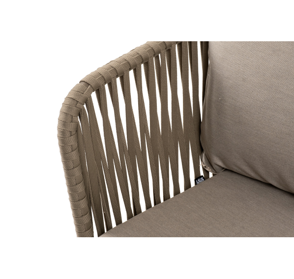 Боковины каркаса и спинка вручную оплетены роупом - эластичными синтетическими лентами, изготовленными из высокопрочных полиэфирных волокон. Цвет оплетки - серо-коричневый. Основание - дуб.