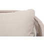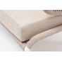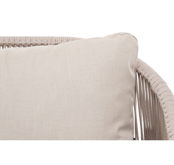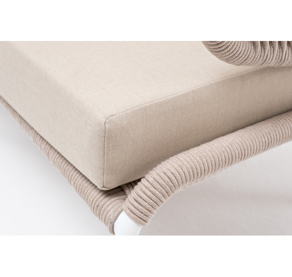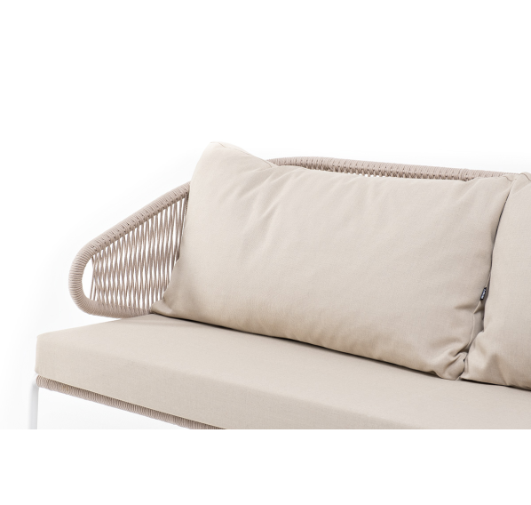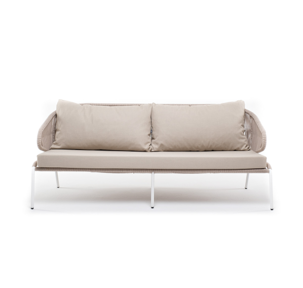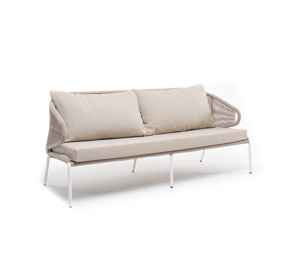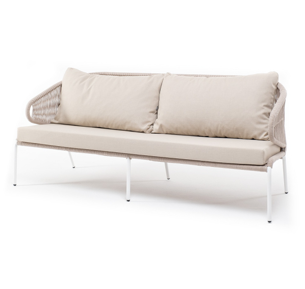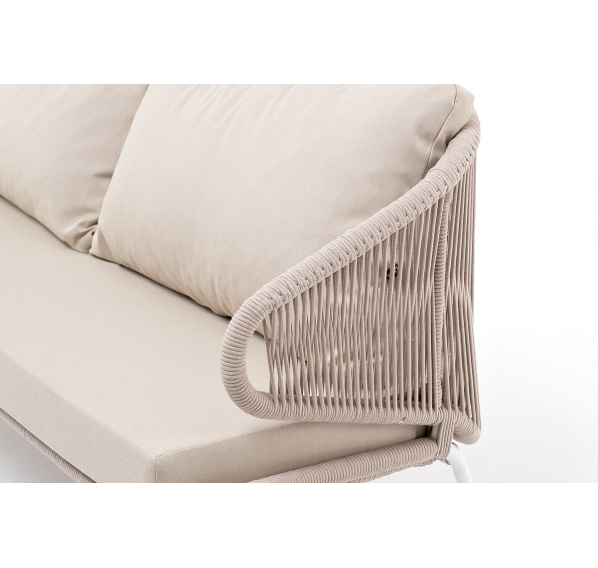 Диван имеет алюминиевый каркас, окрашенный порошковой краской в белый цвет. Боковины каркаса и спинка вручную оплетены роупом - эластичными синтетическими лентами, изготовленными из высокопрочных полиэфирных волокон. Цвет оплетки – бежевый.