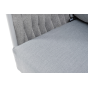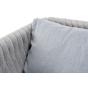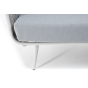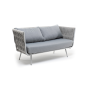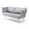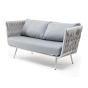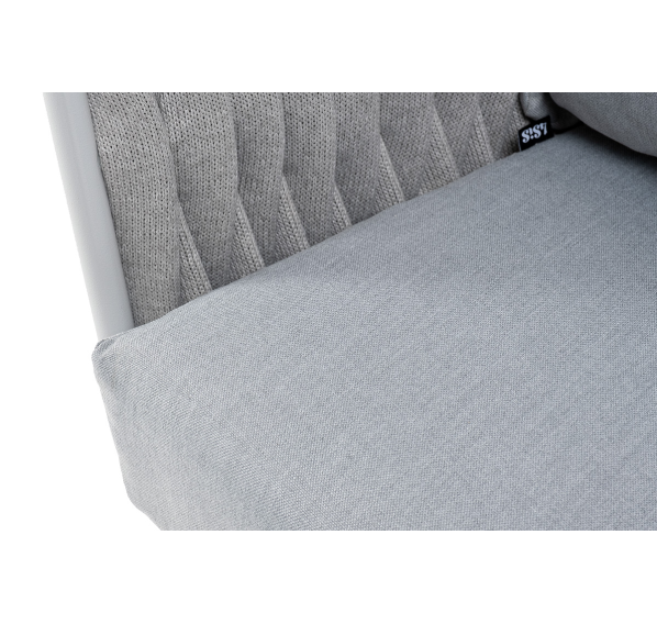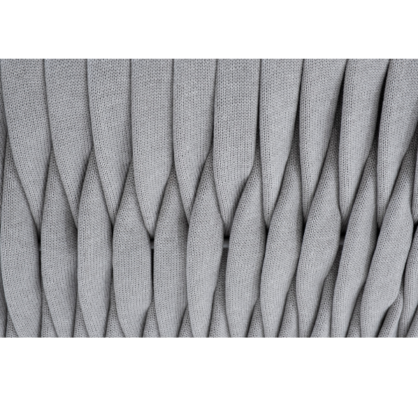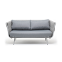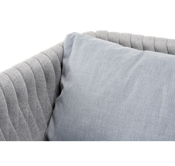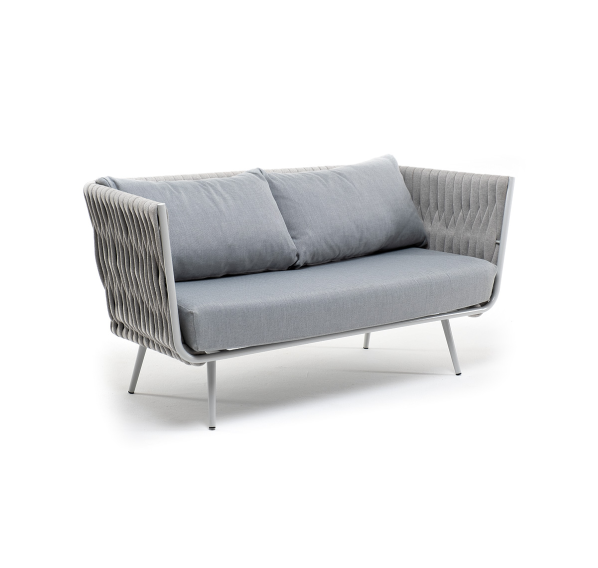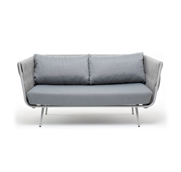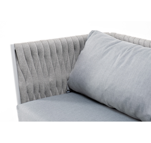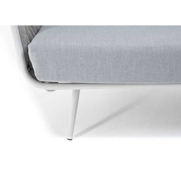 Диван имеет алюминиевый каркас, окрашенный порошковой краской в светло-серый (RAL7035) цвет. Боковины каркаса и спинка вручную оплетены роупом - эластичными синтетическими лентами, изготовленными из высокопрочных полиэфирных волокон. Цвет оплетки - светло-серый.