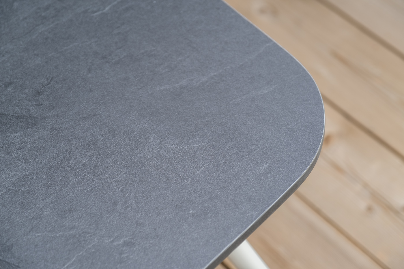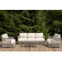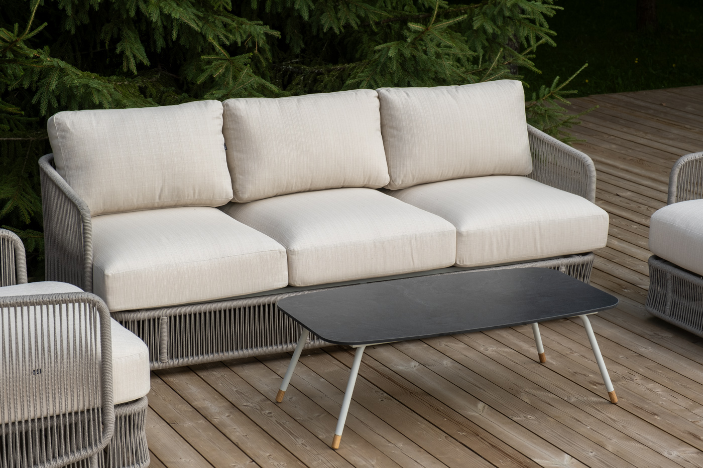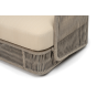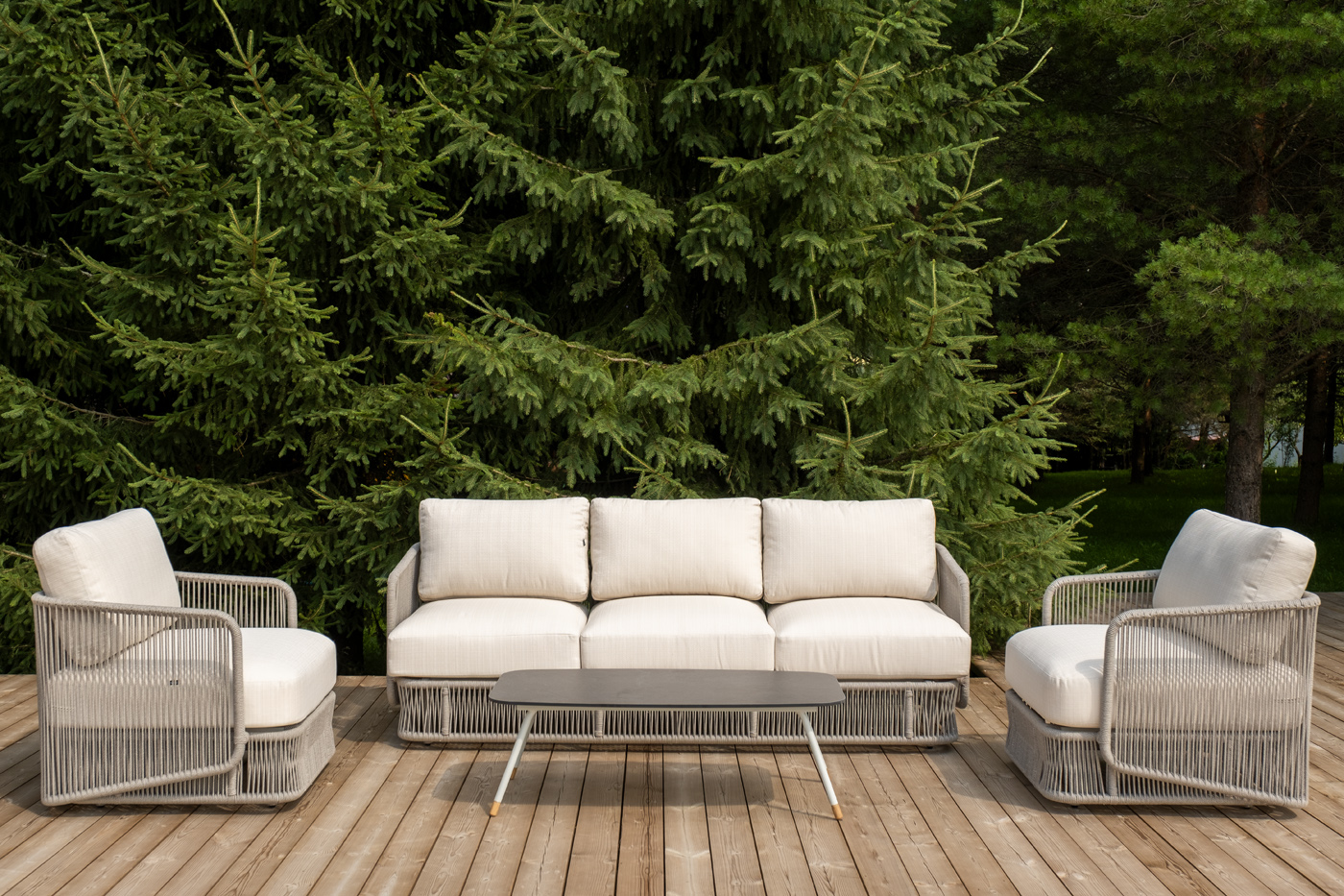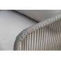 Каркас уличной мебели выполнен из износостойкого алюминия. Его дополняет бежевая ручная оплетка, изготовленная на основе эластичных синтетических лент из полиэфирных волокон высокой прочности (роупа).