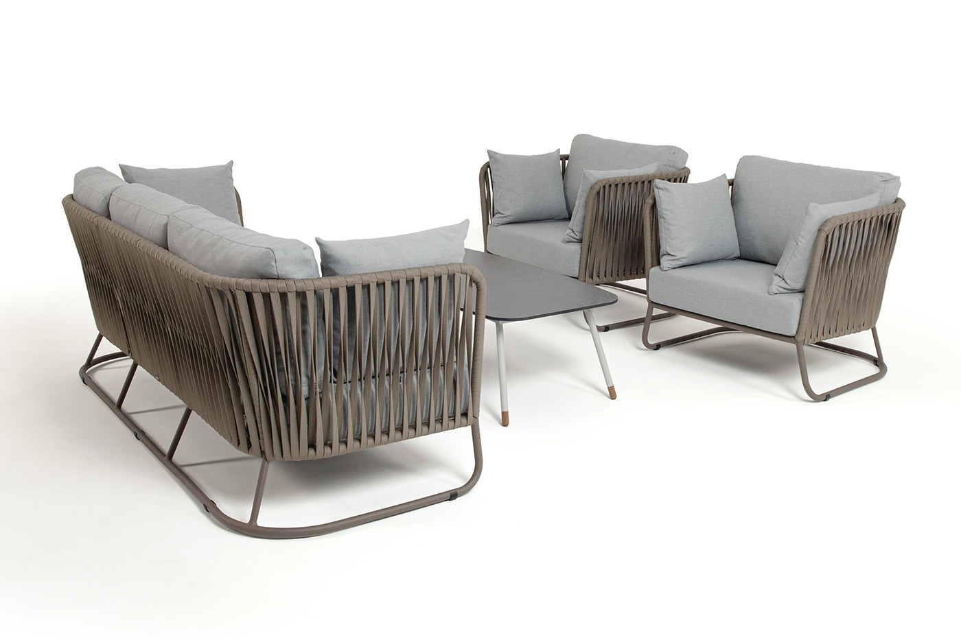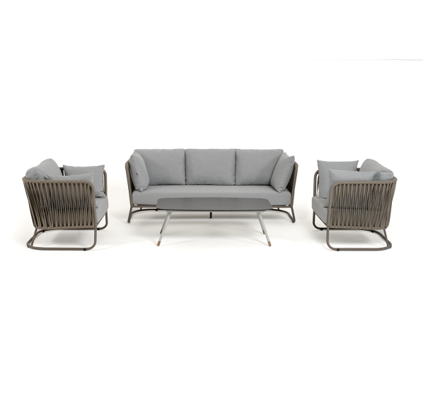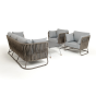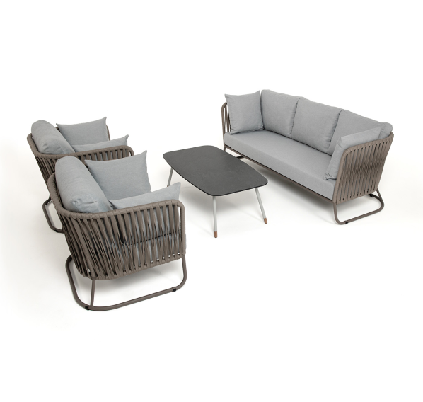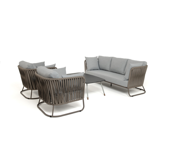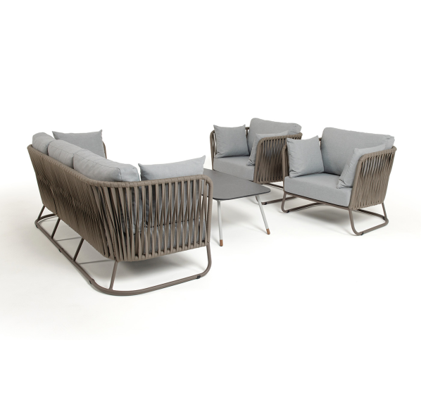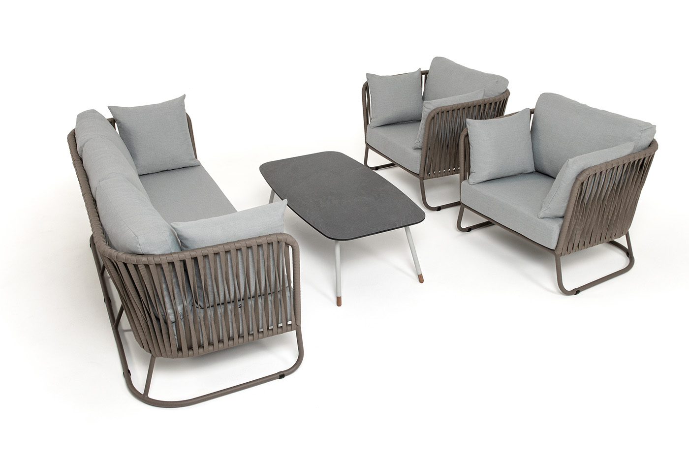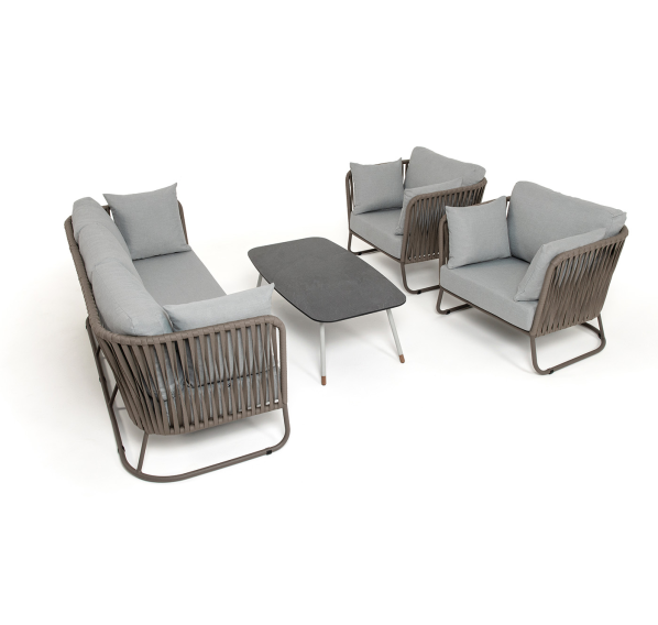 Каркас уличной мебели выполнен из износостойкого алюминия. Его дополняет серо-коричневая ручная оплетка, изготовленная на основе эластичных синтетических лент из полиэфирных волокон высокой прочности (роупа).