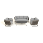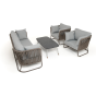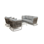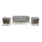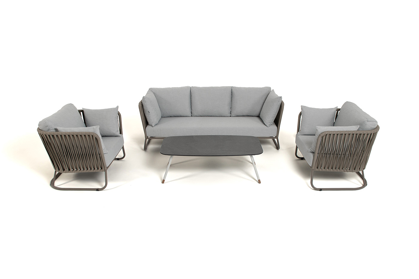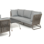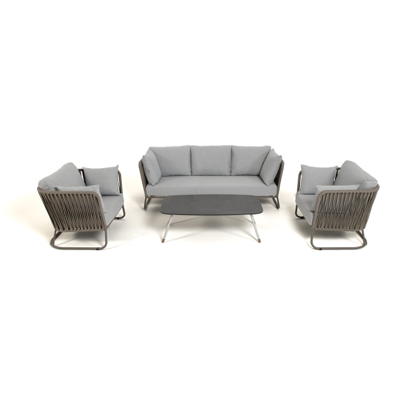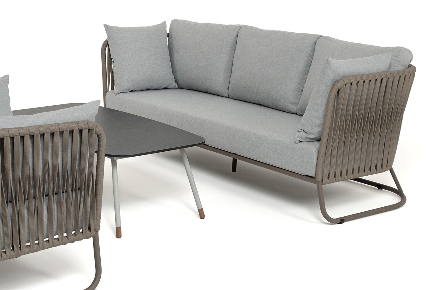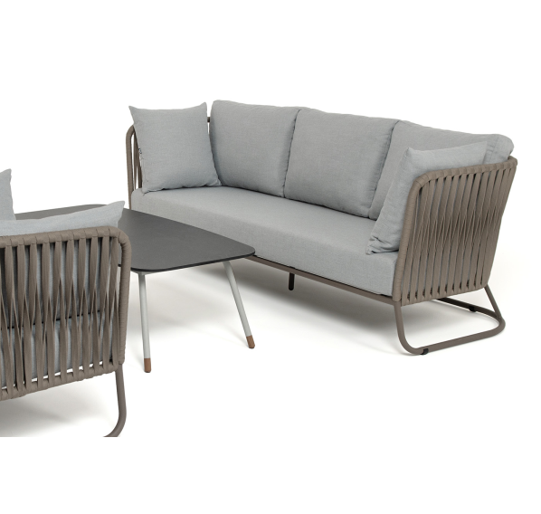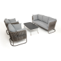 Каркас уличной мебели выполнен из износостойкого алюминия. Его дополняет серо-коричневая ручная оплетка, изготовленная на основе эластичных синтетических лент из полиэфирных волокон высокой прочности (роупа).