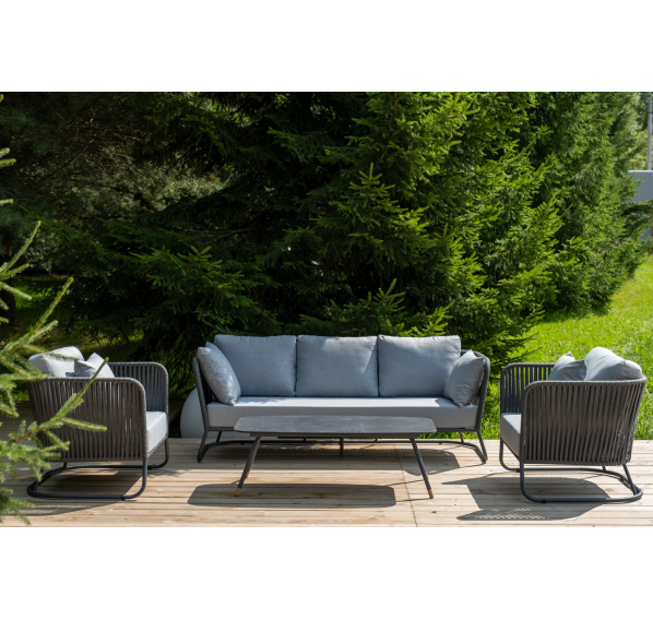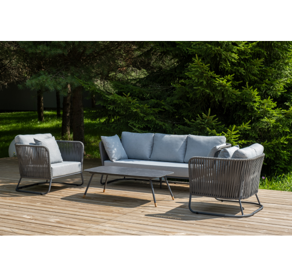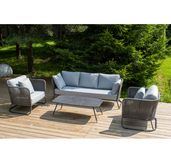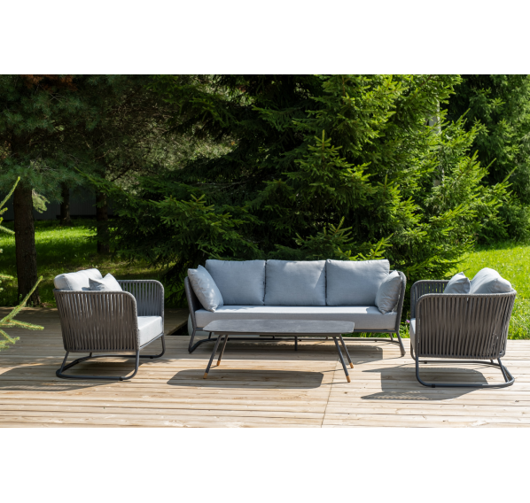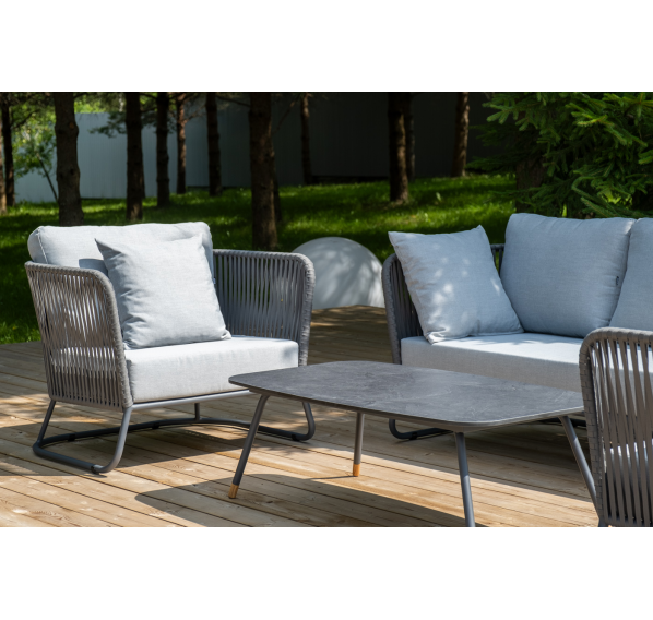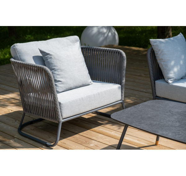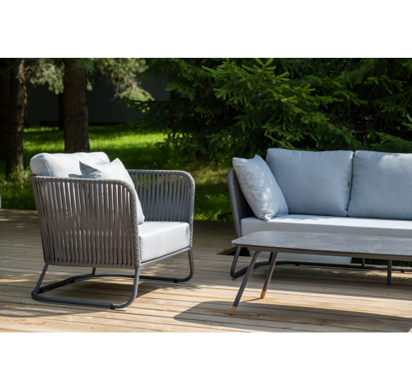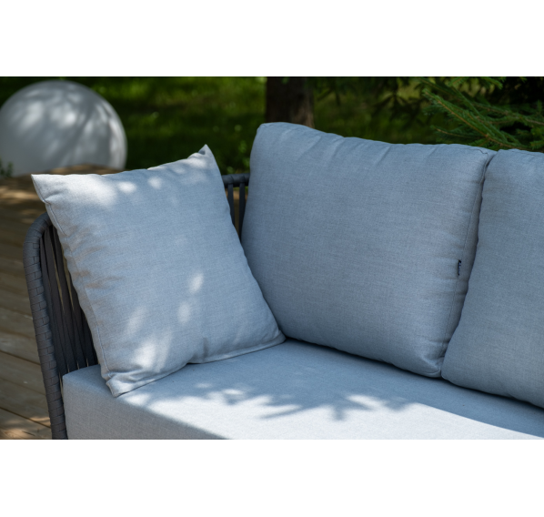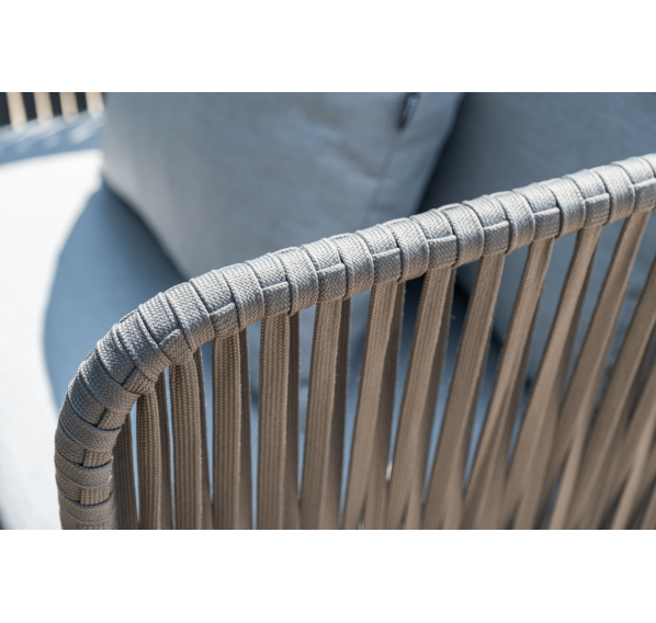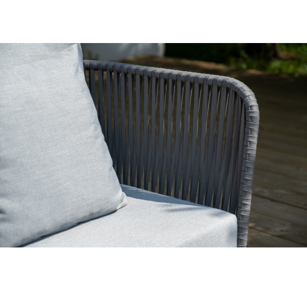 Каркас уличной мебели выполнен из износостойкого алюминия. Его дополняет серая ручная оплетка, изготовленная на основе эластичных синтетических лент из полиэфирных волокон высокой прочности (роупа).
