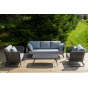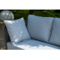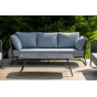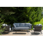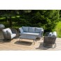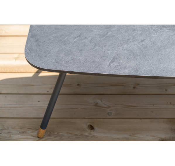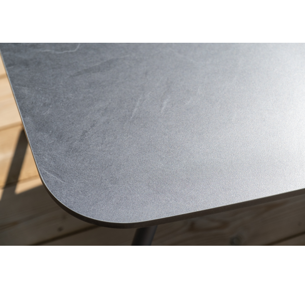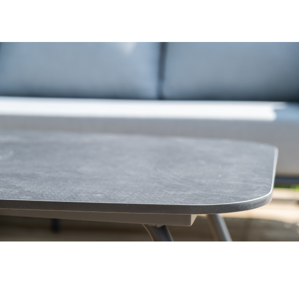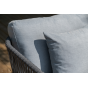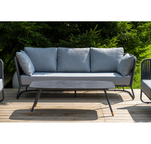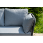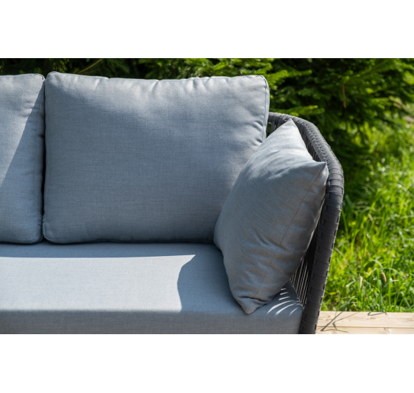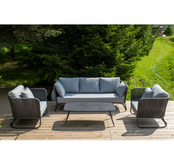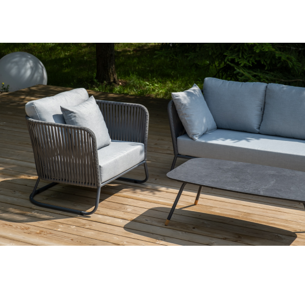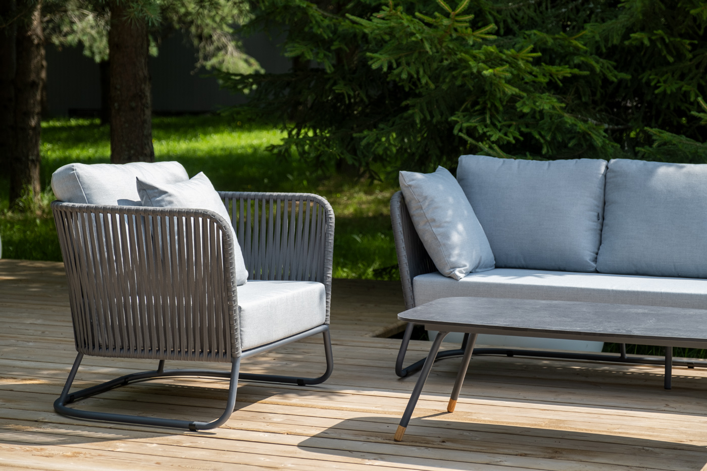 Каркас уличной мебели выполнен из износостойкого алюминия. Его дополняет серая ручная оплетка, изготовленная на основе эластичных синтетических лент из полиэфирных волокон высокой прочности (роупа).
