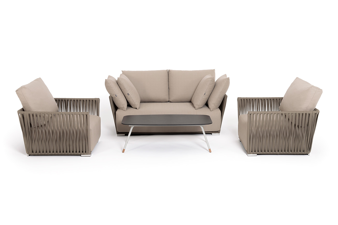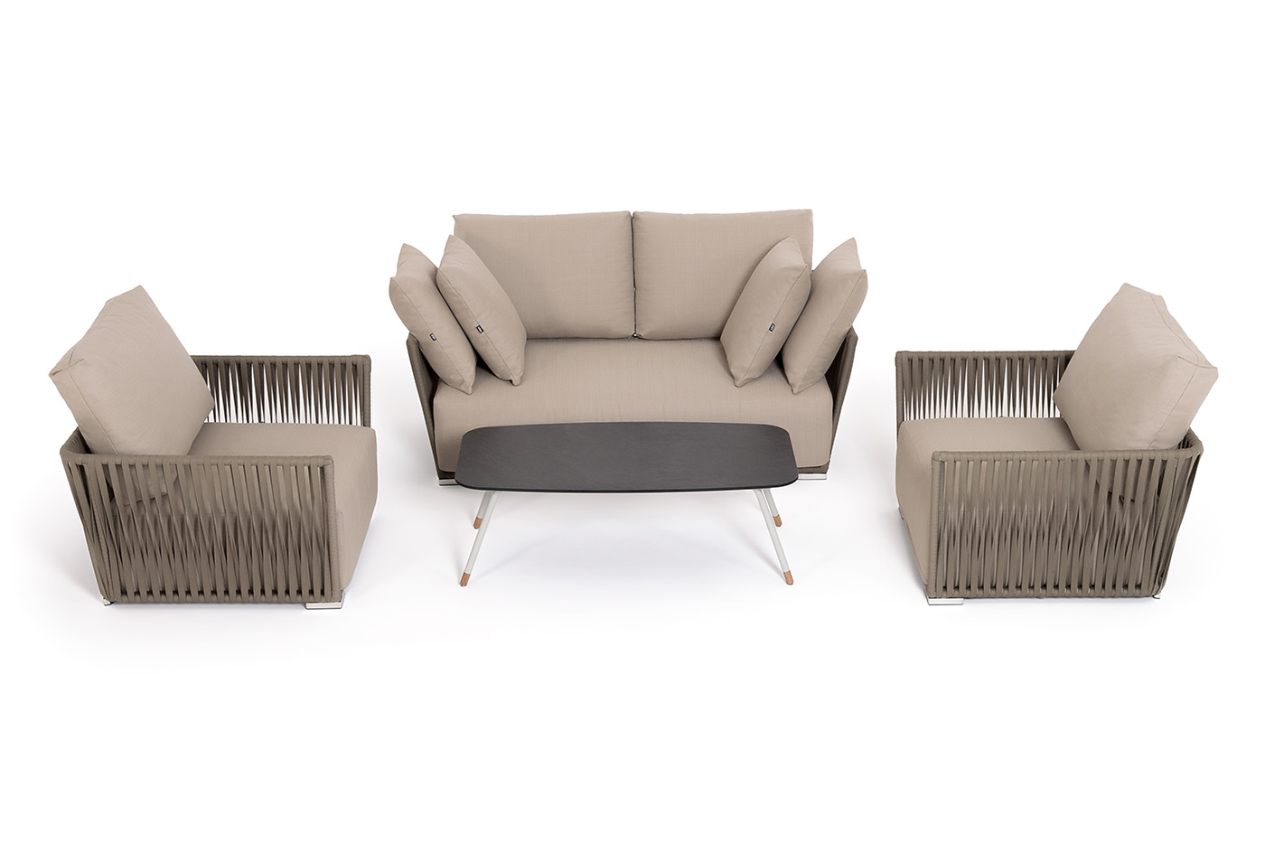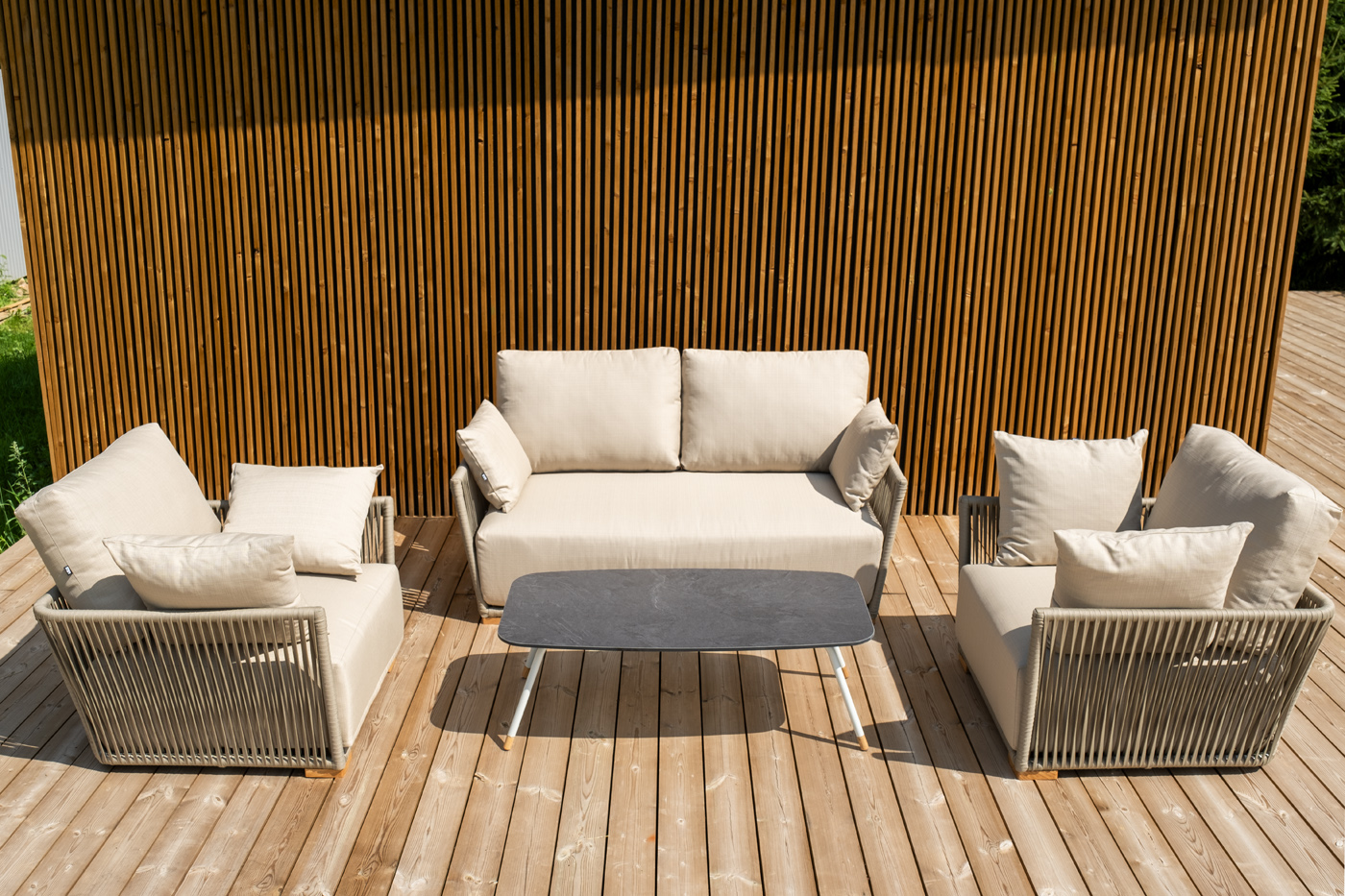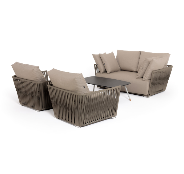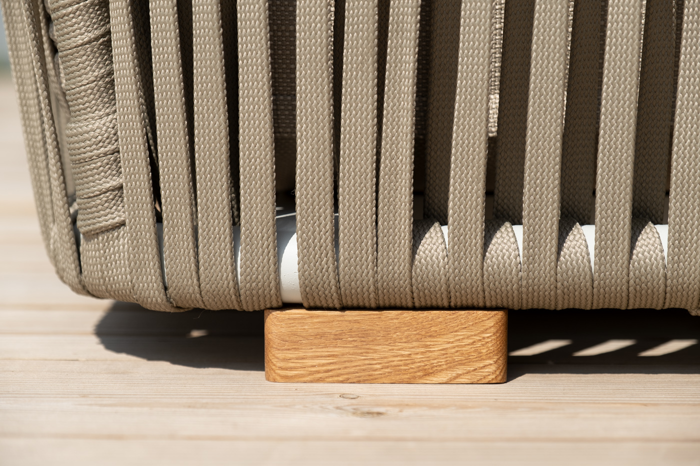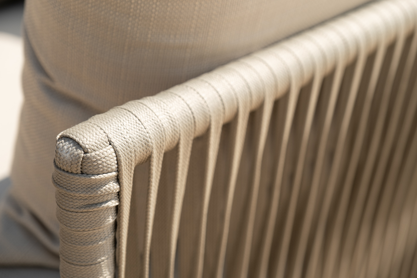 Каркас уличной мебели выполнен из износостойкого алюминия. Его дополняет серо-коричневая ручная оплетка, изготовленная на основе эластичных синтетических лент из полиэфирных волокон высокой прочности (роупа).