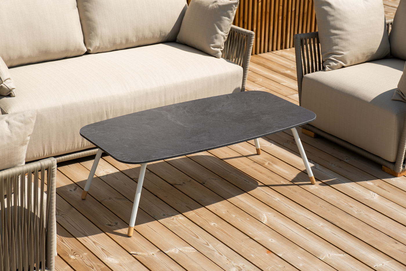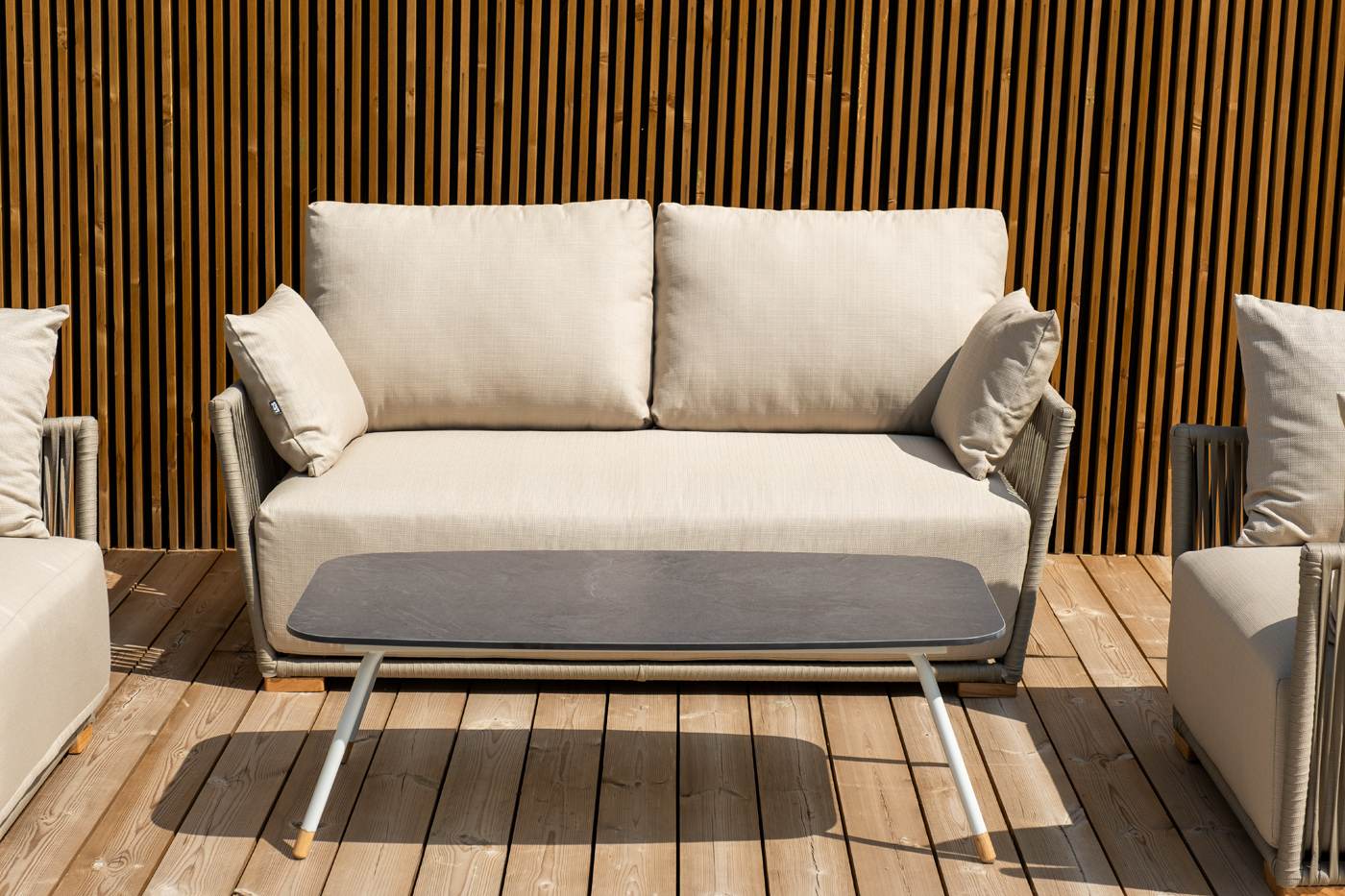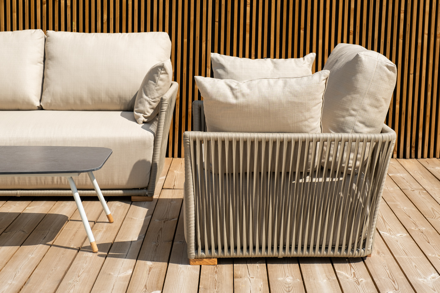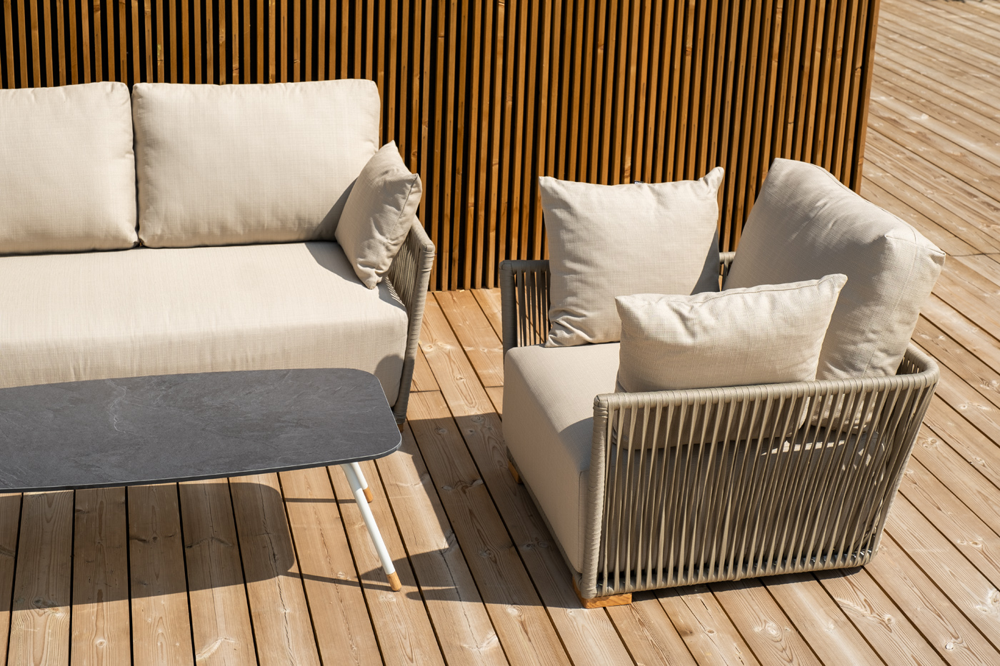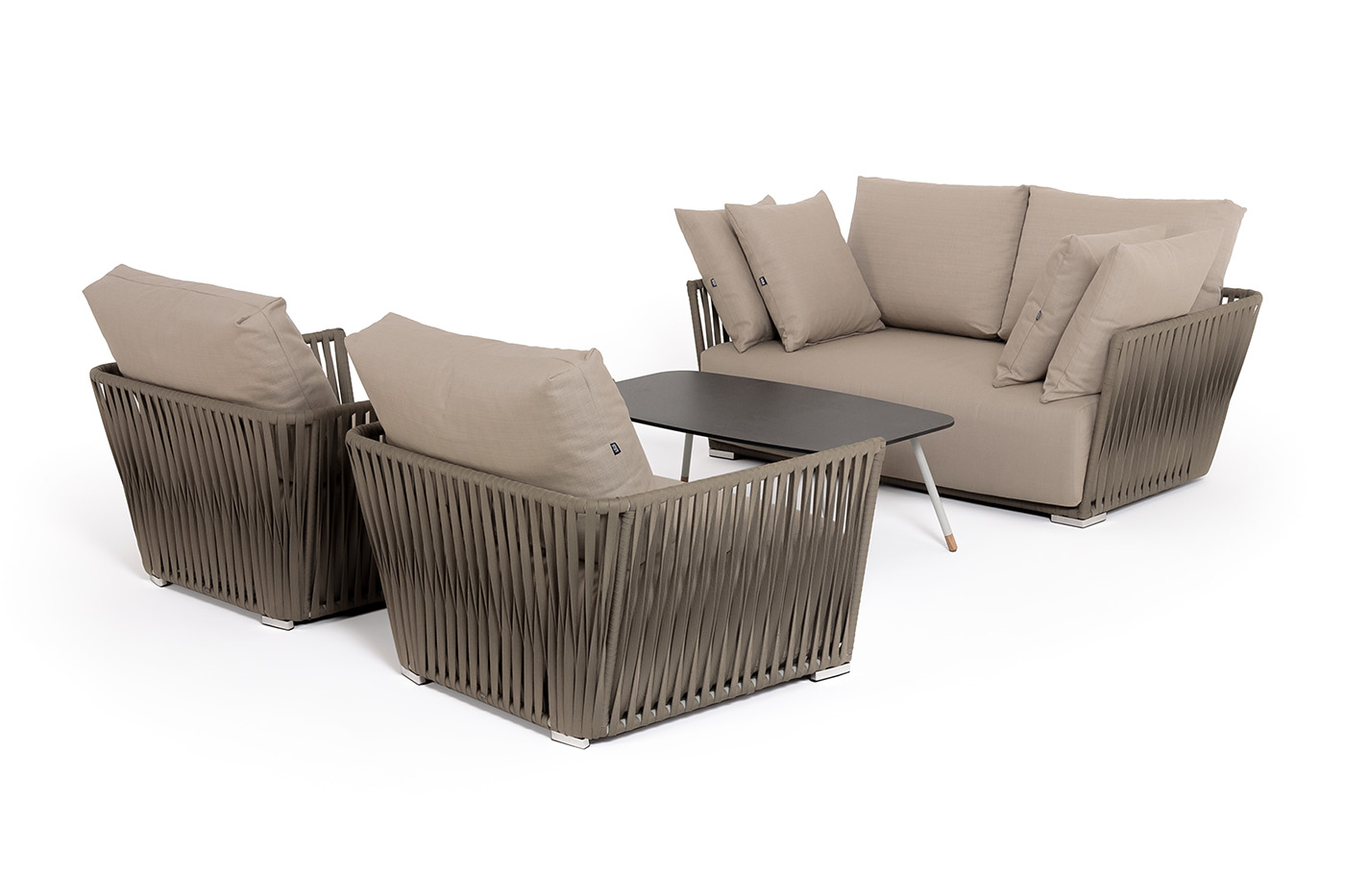Каркас уличной мебели выполнен из износостойкого алюминия. Его дополняет серо-коричневая ручная оплетка, изготовленная на основе эластичных синтетических лент из полиэфирных волокон высокой прочности (роупа).