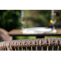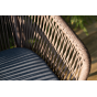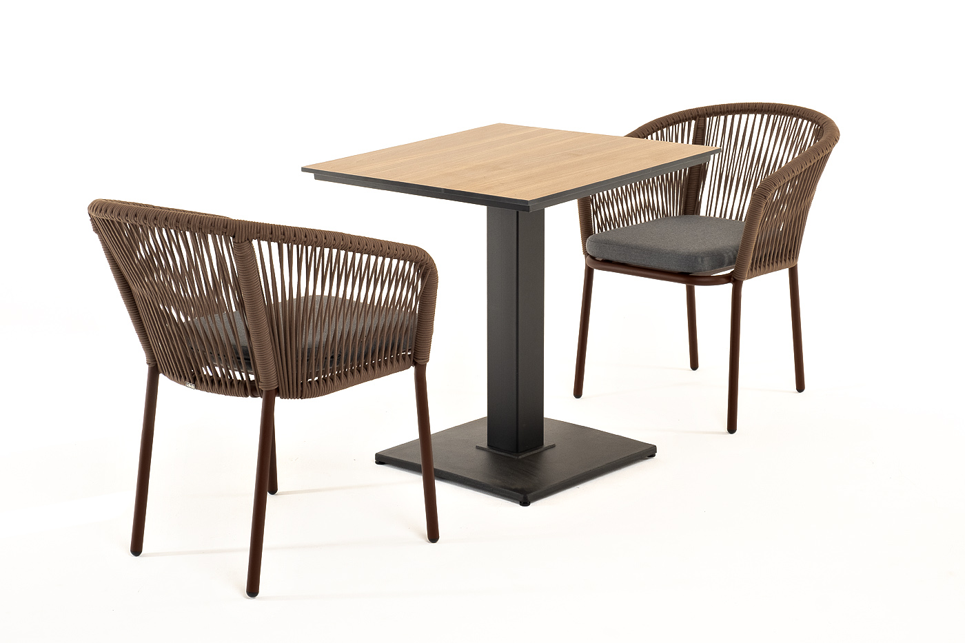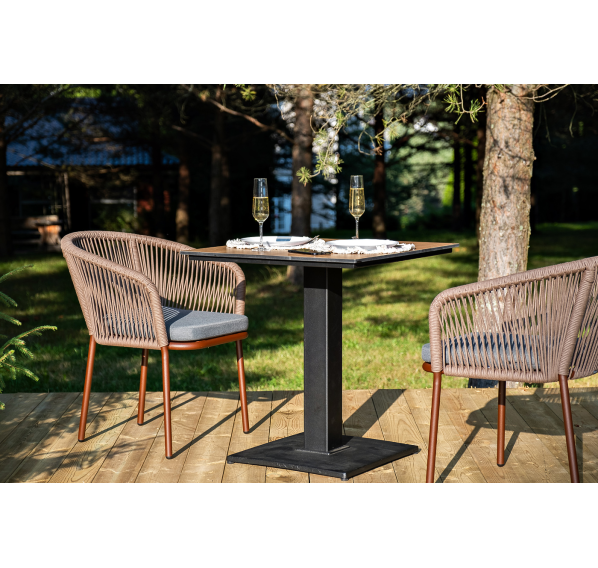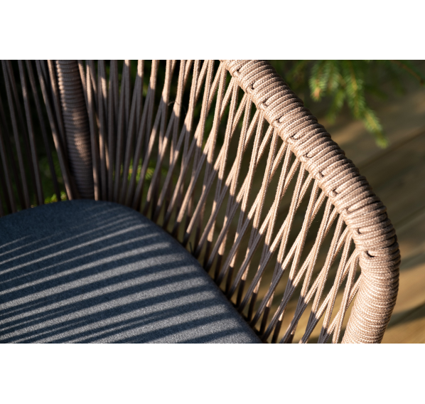 Стулья оснащены алюминиевым каркасом, которые вручную оплетены плоским роупом коричневого цвета.
