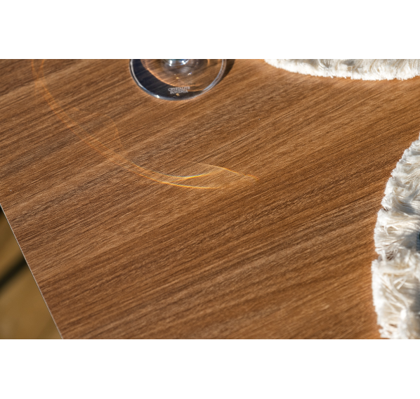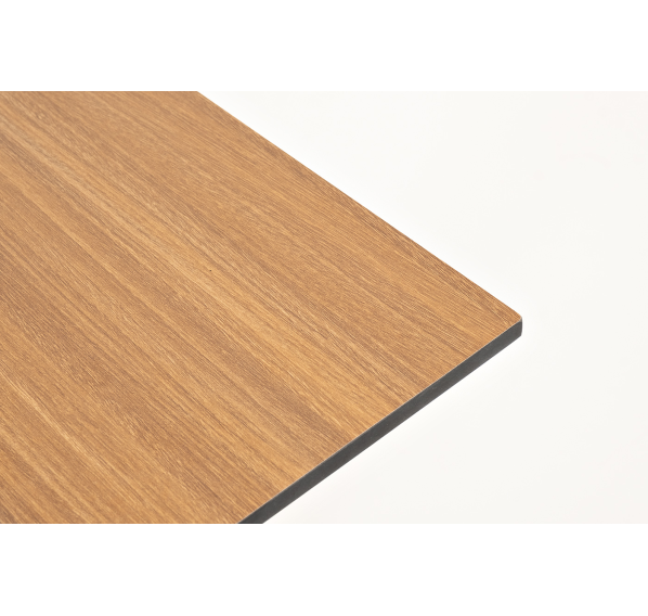 Интерьерный стол изготовлен из металлического подстолья, окрашенного в черный цвет, и столешницы из компактного пластика HPL в цвете «дуб». Благодаря массивному основанию столик устойчив на любых поверхностях.